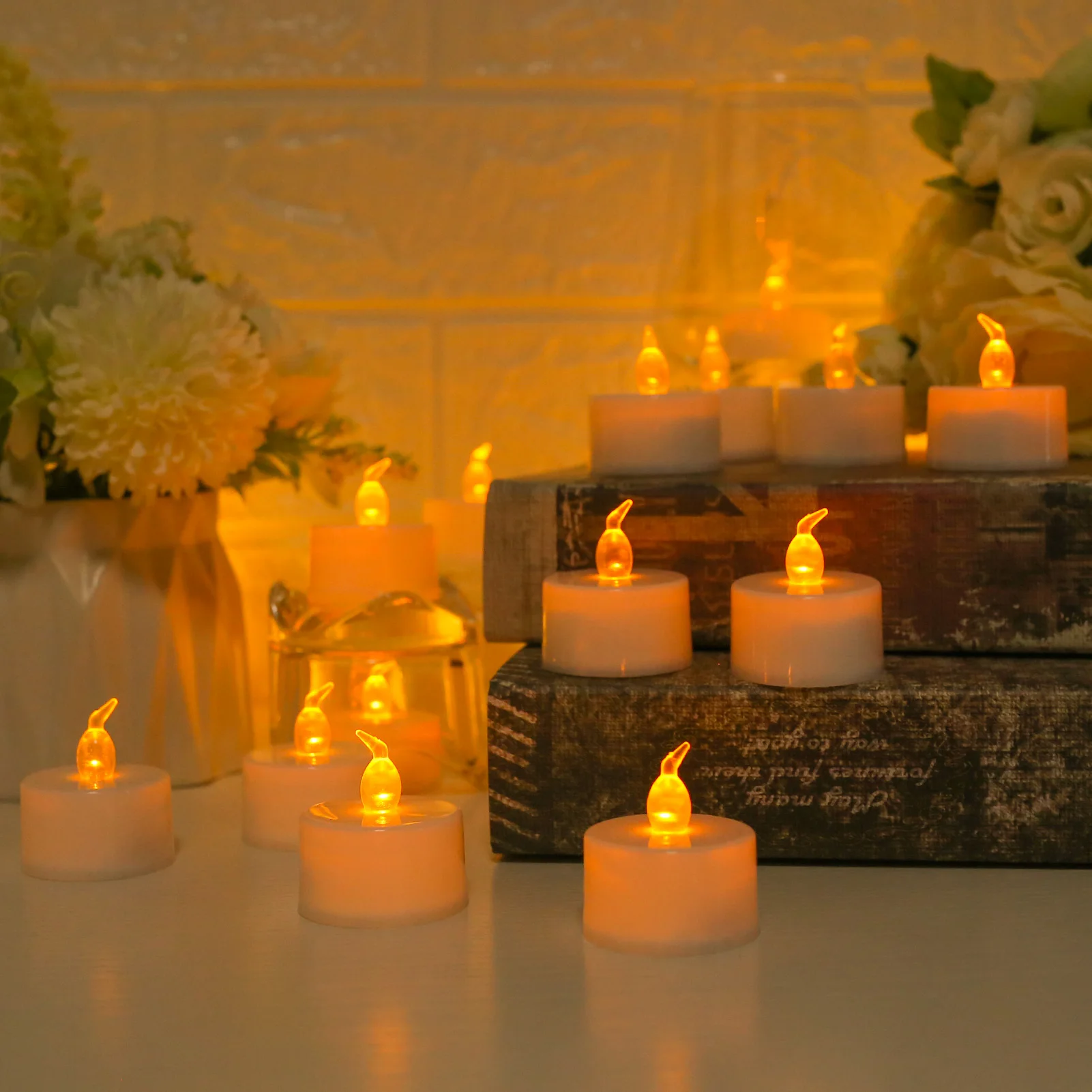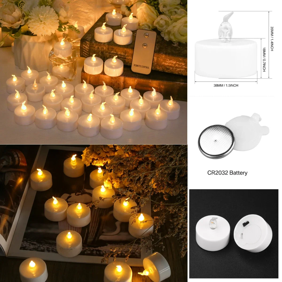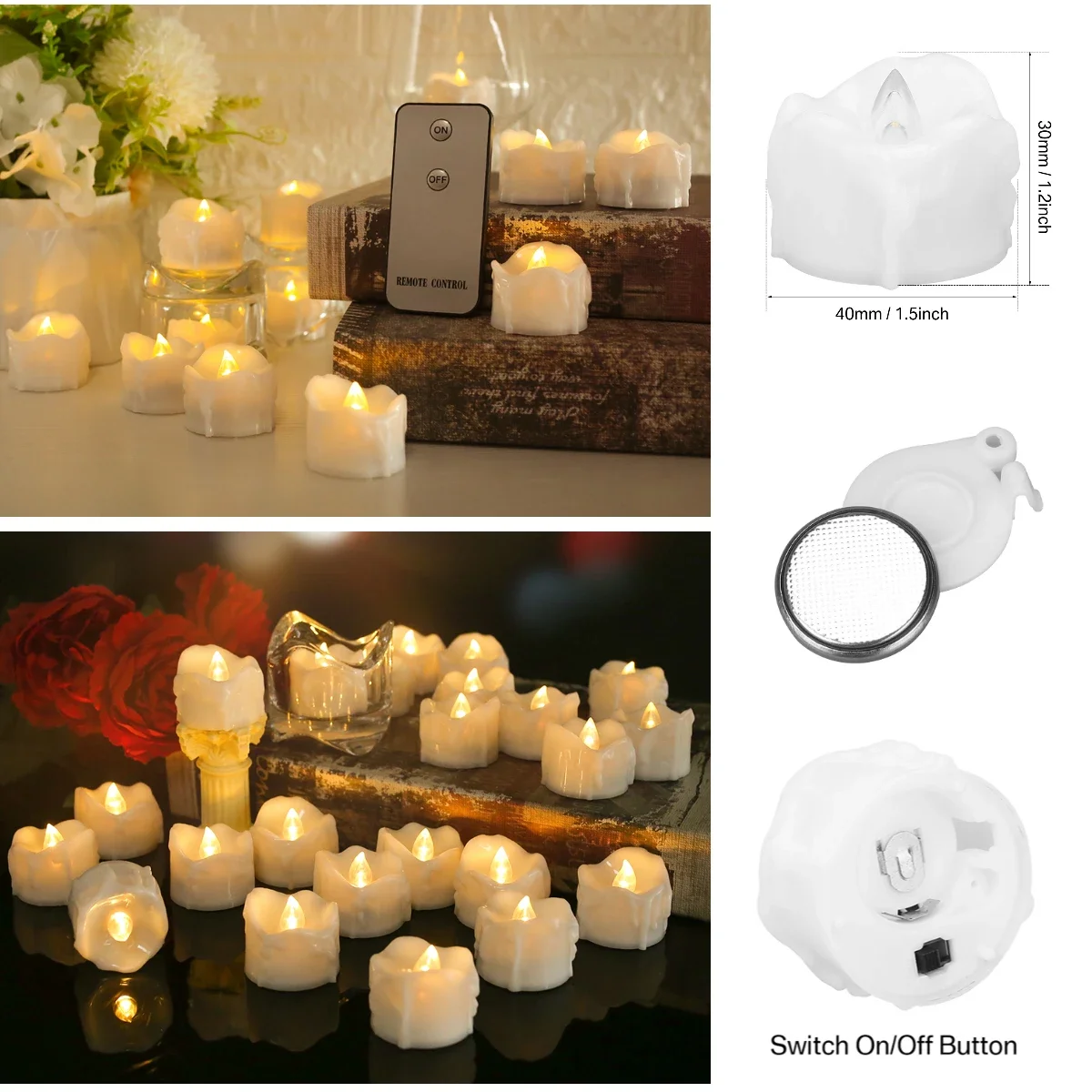 Experience the warm, romantic glow of these flameless LED tea lights, measuring 3.5 cm in diameter and 4 cm in height, with a flickering warm white/yellow light producing between 60-249 lumens. Equipped with a CR2032 battery lasting over 150 hours, they feature remote control operation and a built-in timer cycle of 6 hours on and 18 hours off, repeating daily. Made from durable polypropylene, these smoke-free, flameless candles are safe for children, pets, and seniors, with no dripping wax or fire hazards. Ideal for creating cozy atmospheres at home, parties, weddings, or festivals, they are available in packages of 6, 12, or 24 pieces, with batteries included and easily replaceable.