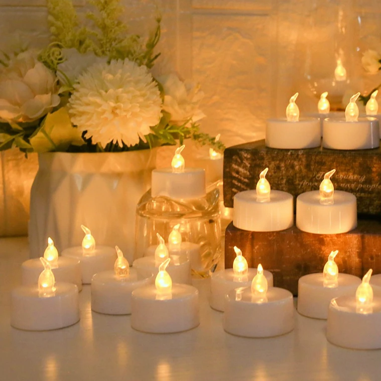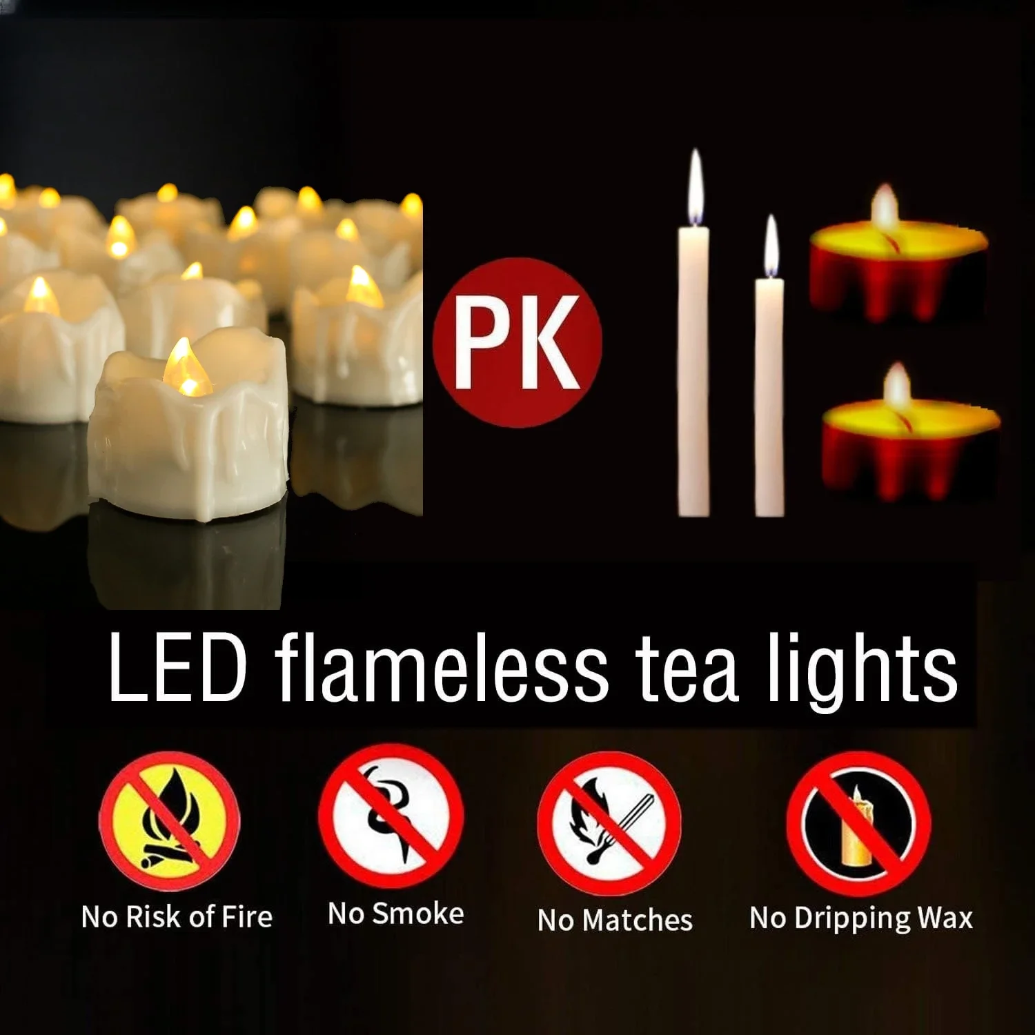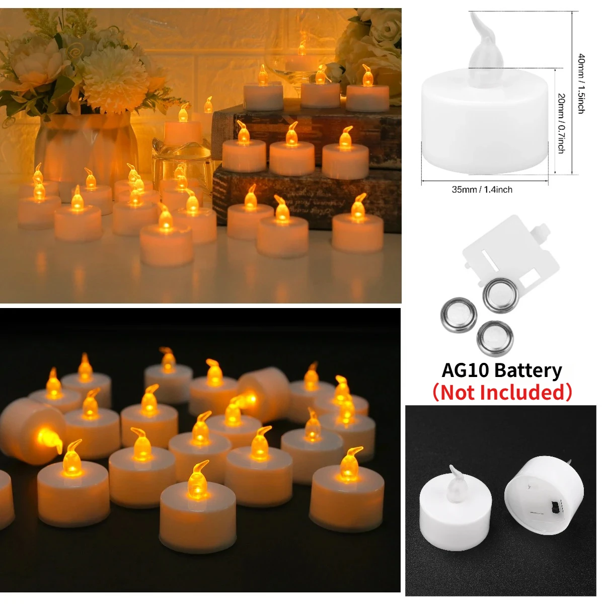 Experience the warm, romantic glow of these flameless LED tea lights, measuring 3.5 cm in diameter and 4 cm in height, with a flickering warm white/yellow light producing between 60-249 lumens. Equipped with a CR2032 battery lasting over 150 hours, they feature remote control operation and a built-in timer cycle of 6 hours on and 18 hours off, repeating daily. Made from durable polypropylene, these smoke-free, flameless candles are safe for children, pets, and seniors, with no dripping wax or fire hazards. Ideal for creating cozy atmospheres at home, parties, weddings, or festivals, they are available in packages of 6, 12, or 24 pieces, with batteries included and easily replaceable.