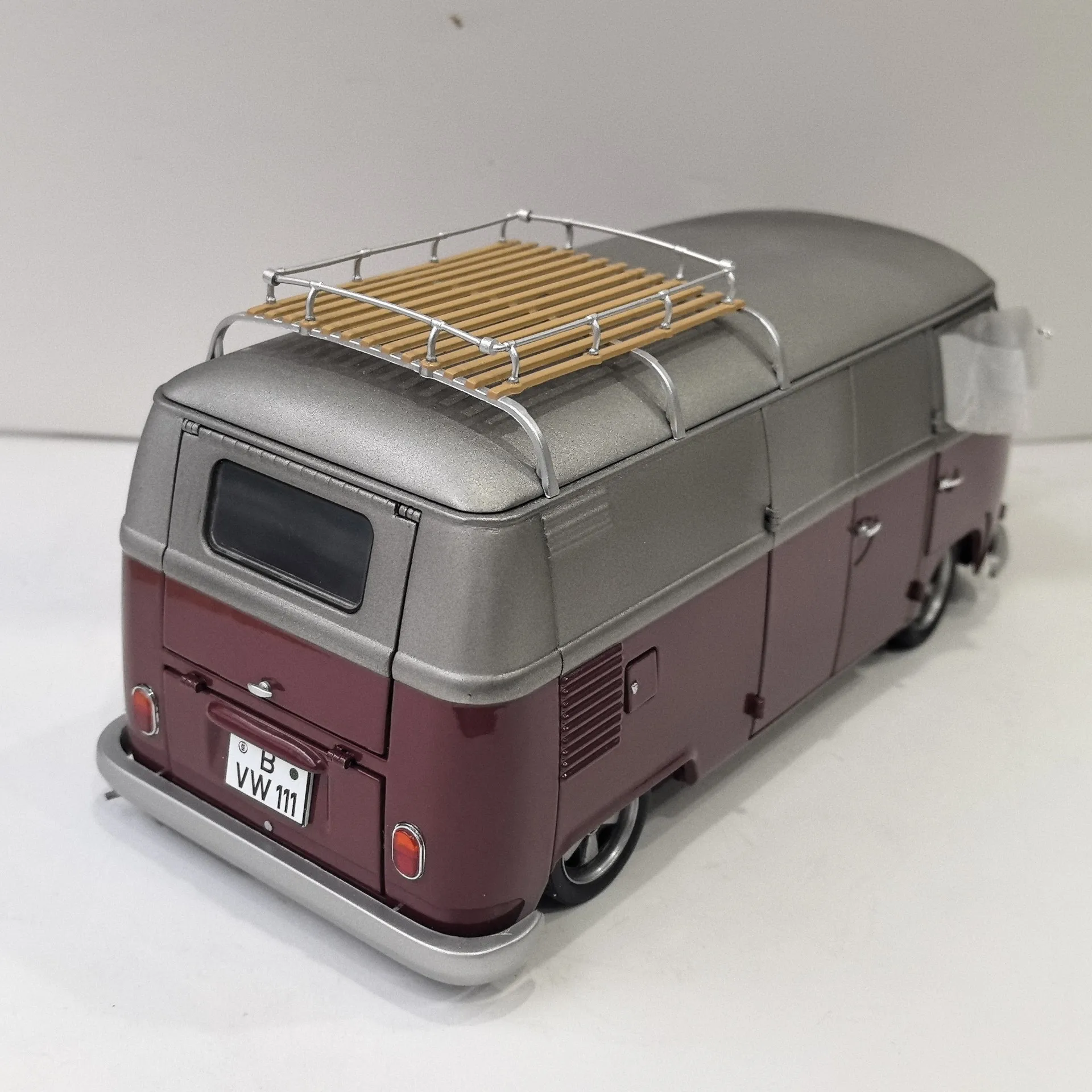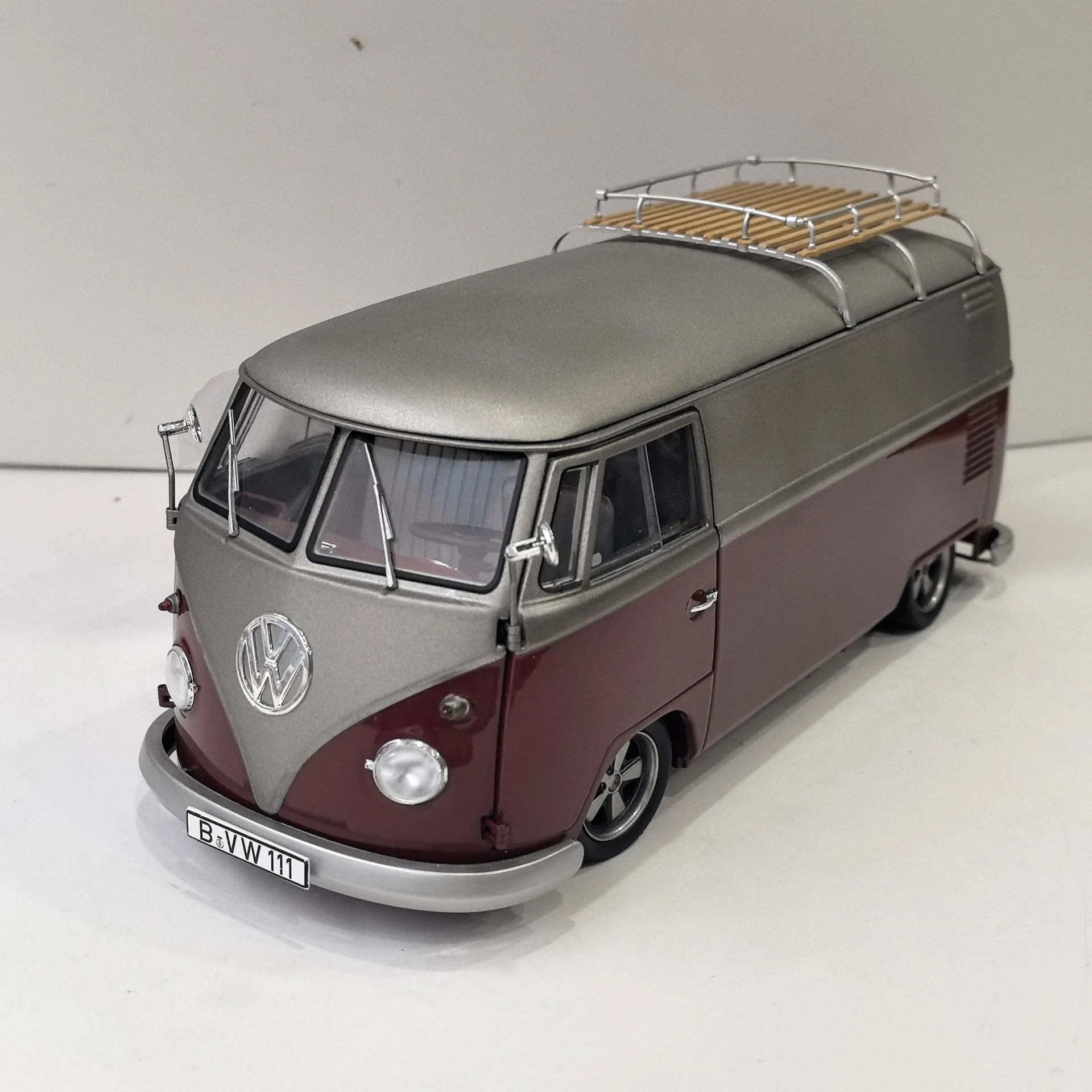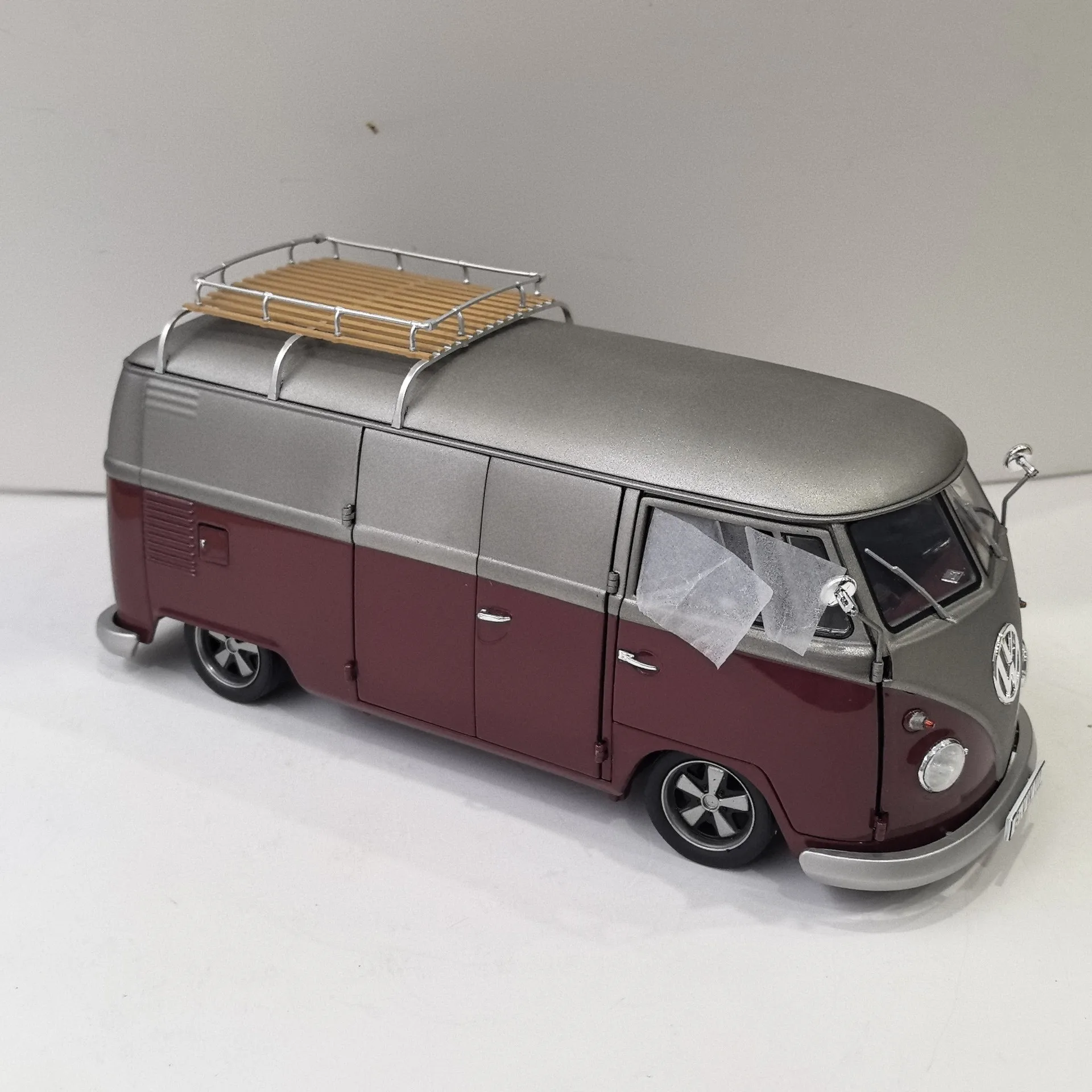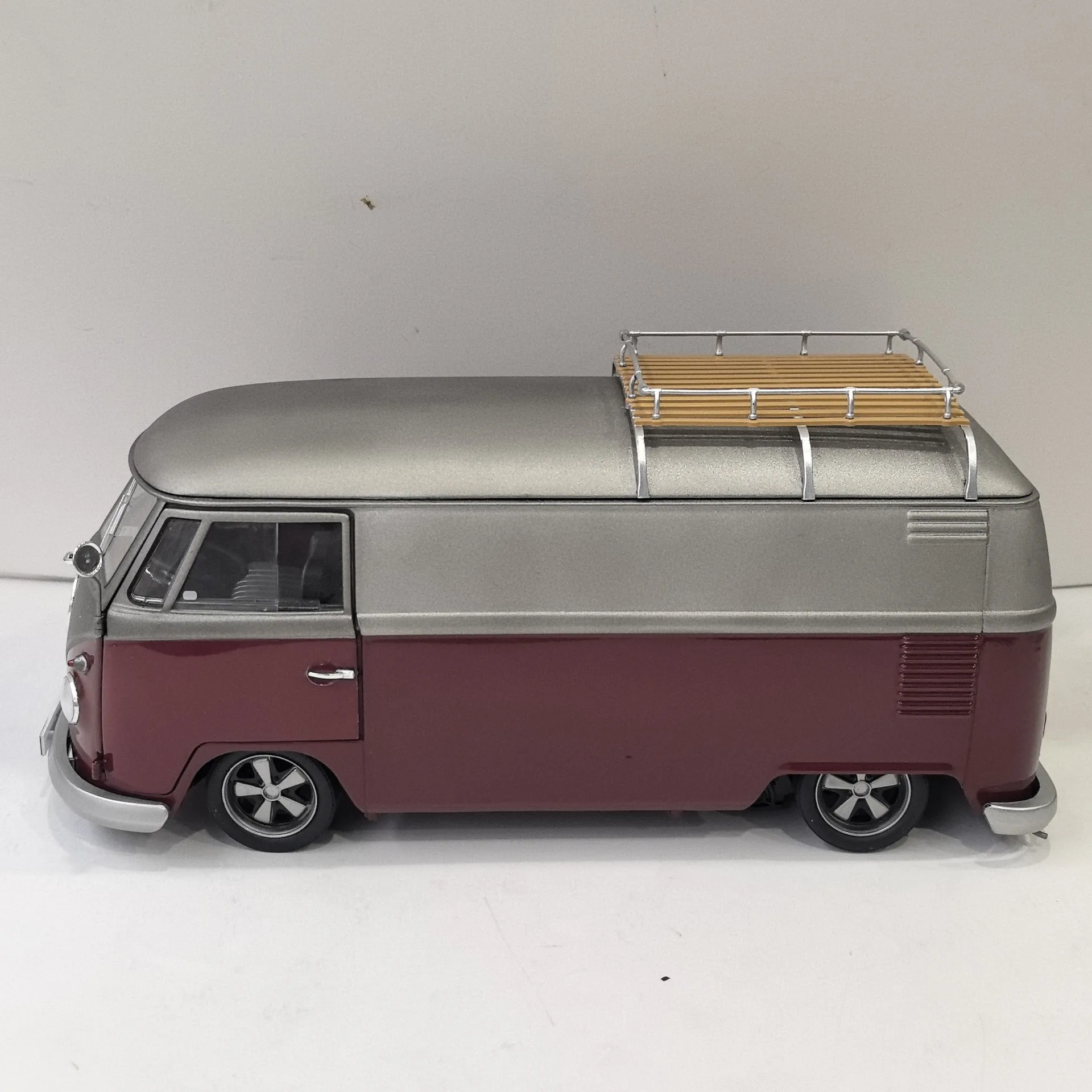 Experience nostalgic charm with this 1:18 scale diecast model of a Volkswagen T1 Lowrider, measuring approximately 18 cm in length. Crafted from alloys and plastics, this static collectible features a vintage-inspired design with a distinctive flaw-colored finish that highlights its textured, rustic appearance. The model showcases a classic van silhouette with a sleek, rounded body, two-tone deep red and beige color scheme, alloy wheels, and a metal roof rack with a wooden or orange platform. Designed for adult collectors aged 14+ and 18+, it offers a detailed, nostalgic display piece without electronic features or functionality, perfect for showcasing your appreciation for vintage vehicles.