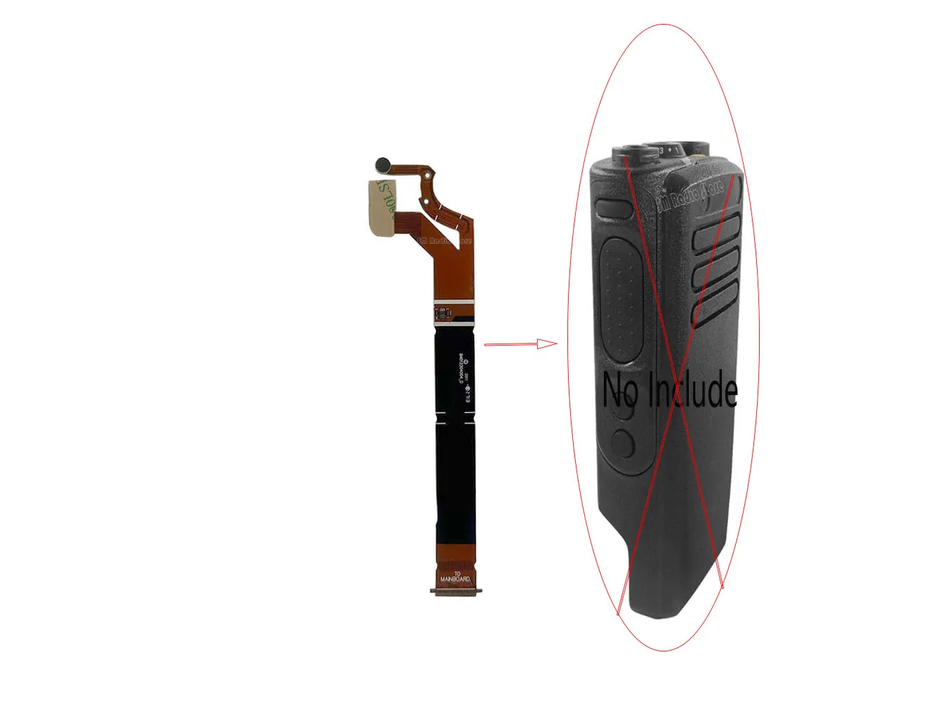 - Technical specifications include compatibility with DP4400, DP4401, XPR7350, XPR7380, DGP8050, DGP5050, P8600, and P8608 radios; length approximately 20″; material: flexible ribbon cable.