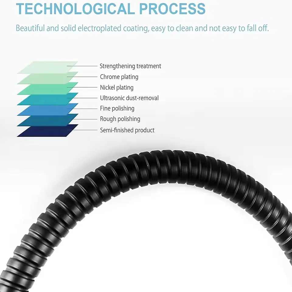 Experience the perfect blend of durability and modern style with this flexible stainless steel shower hose. Available in lengths of 1.5 meters, 2.0 meters, and 3.0 meters, it provides ample reach for comfortable showering and efficient cleaning. Crafted from SUS304 stainless steel, it offers excellent corrosion resistance and robust strength. The matte black or silver finish enhances its sleek, contemporary look, making it a stylish addition to any bathroom. The segmented, ribbed surface not only adds visual texture but also ensures flexibility and ease of movement. Designed with standard fittings, this extension hose is simple to install and compatible with most shower setups. Its flexible design supports easy maneuvering, adapting seamlessly to your bathroom needs.
