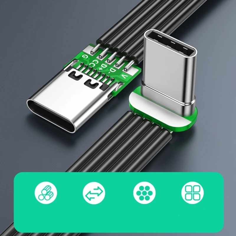 Experience the perfect combination of style and functionality with this premium USB Type-C cable. Its flat, lightweight, and highly flexible design allows for easy use in tight spaces, reducing tangles and making daily charging and data transfer more convenient. Crafted with a smooth matte black finish, the cable exudes modern elegance, complemented by metallic silver connectors that highlight its durability and precision engineering. The small green accent around the connector adds a subtle touch of color, enhancing its aesthetic appeal without compromising its minimalist look. Whether you're at home, in the office, or on the go, this cable seamlessly blends practicality with a sleek design to meet your everyday charging and data transfer needs effortlessly.