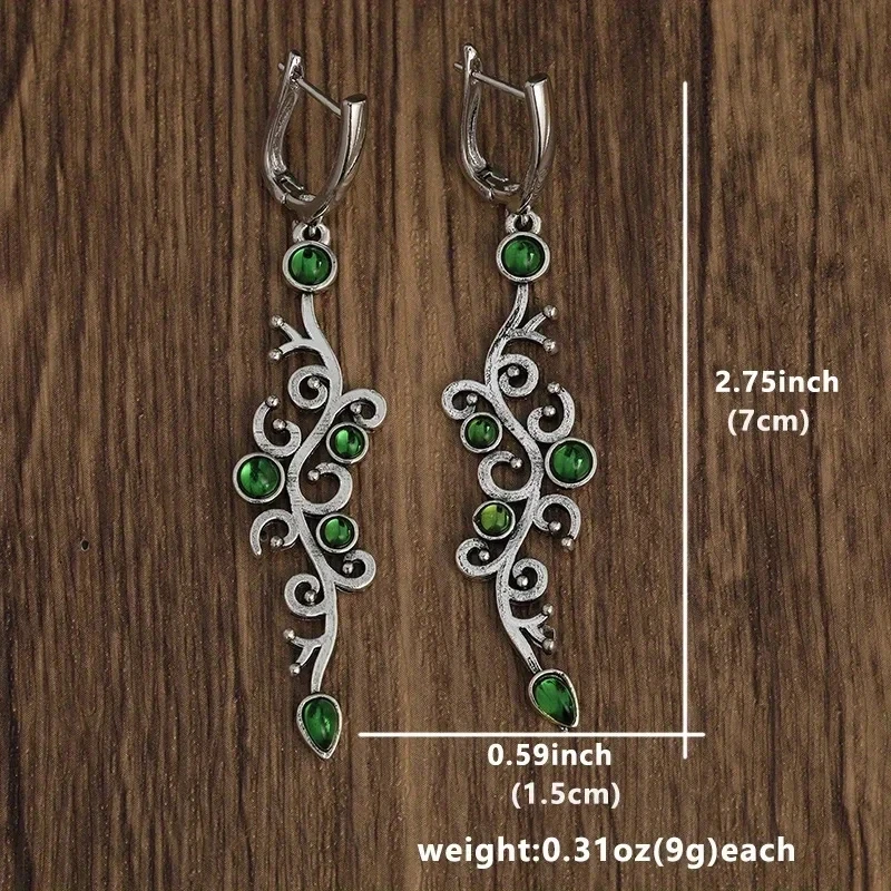 - Technical specifications include zinc alloy material, accented with green stones, approximately 5cm in length, suitable for pierced ears, with silver and gold color options for tailored style preferences.