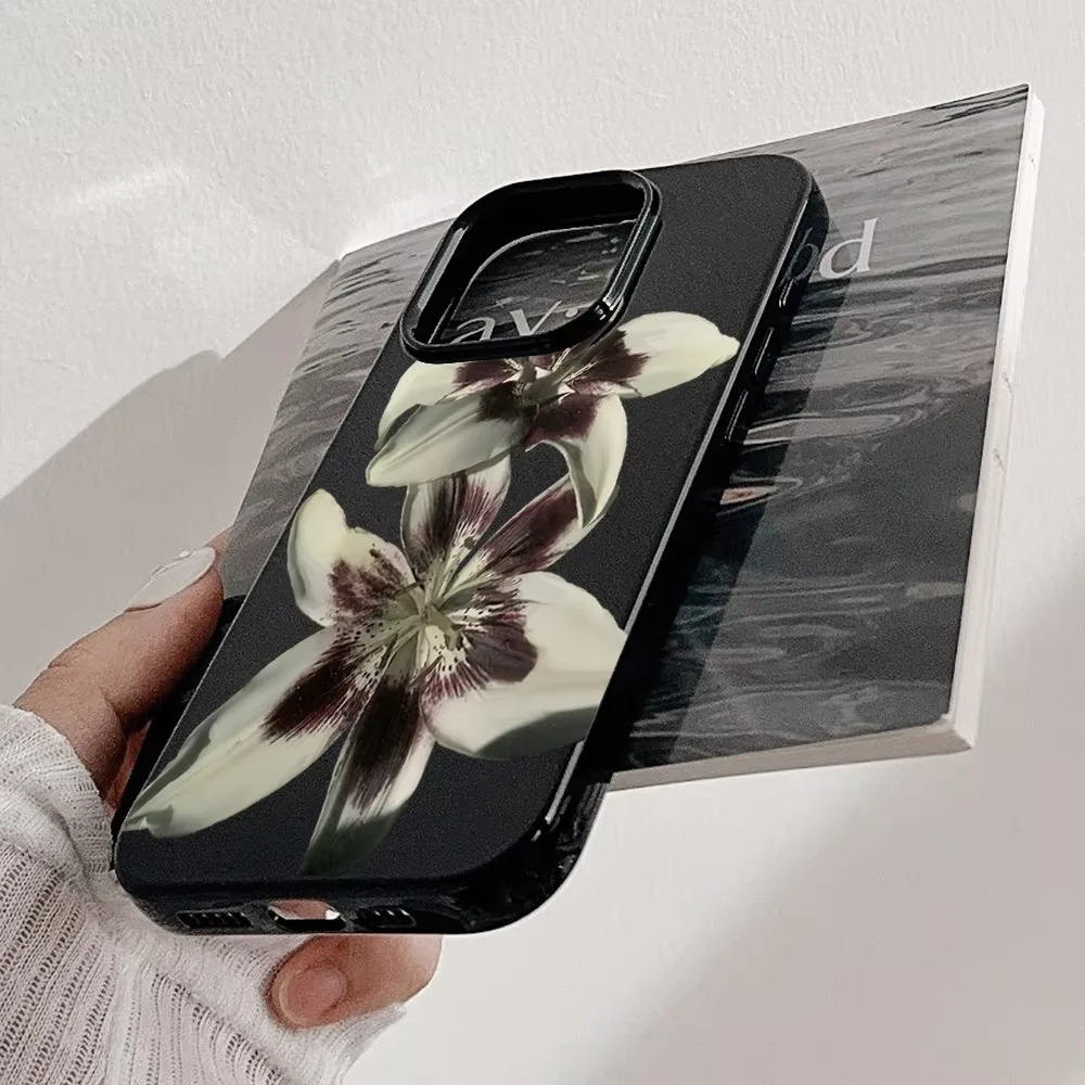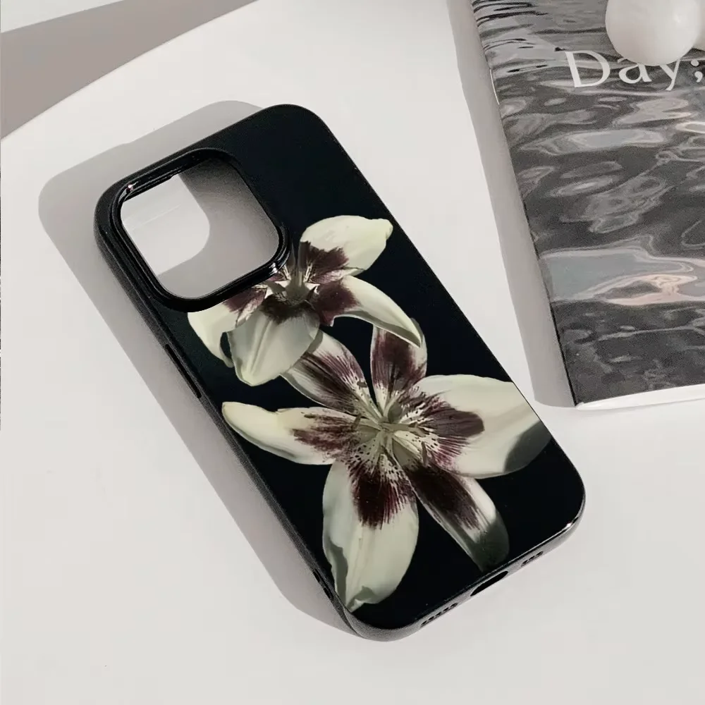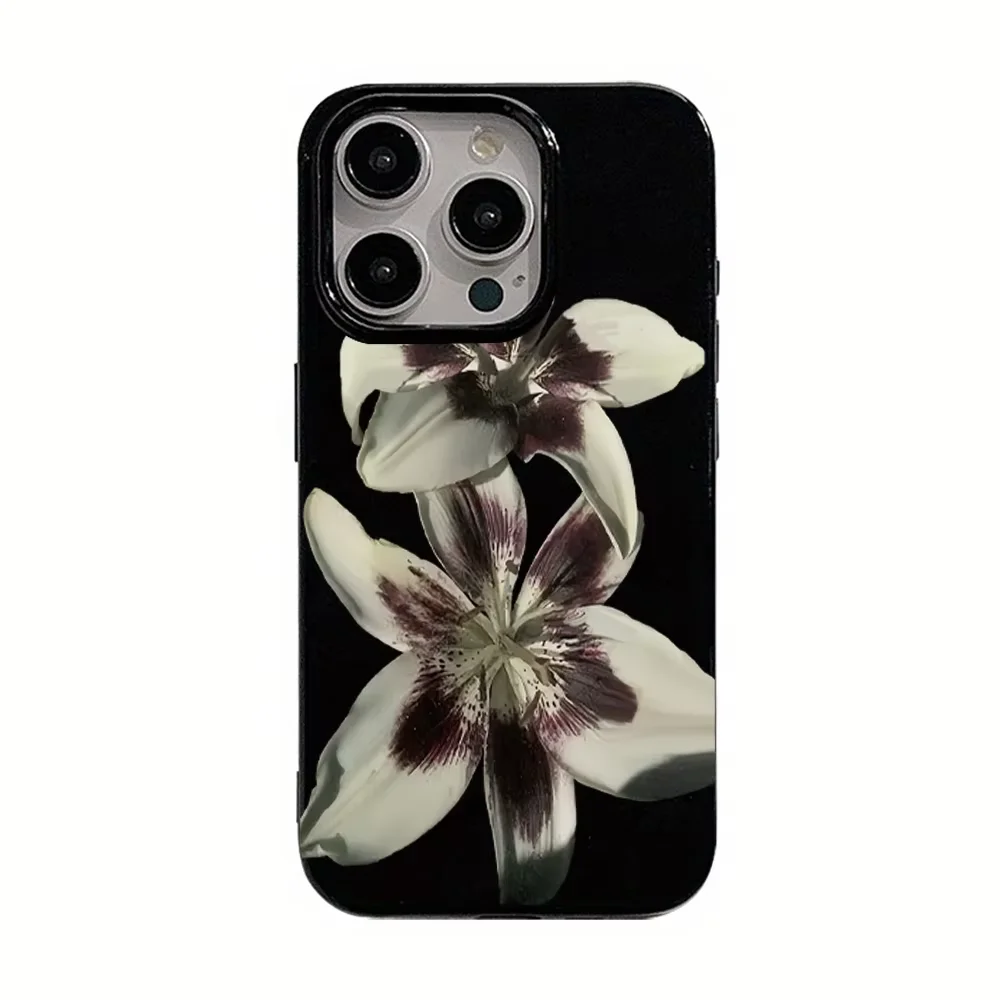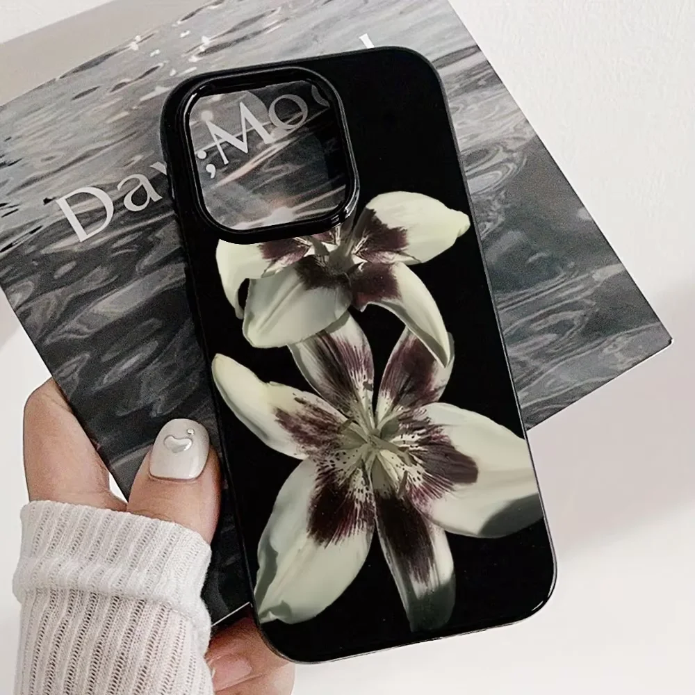 Step into sophistication with this beautiful floral pattern phone case designed specifically for your iPhone. Crafted with a glossy black finish and intricate flower design reminiscent of orchids or lilies, it offers a timeless blend of elegance and style. The realistic flower features cream or off-white petals accented by dark purple or brown streaks, adding a natural yet artistic touch. Made from durable silicone and plastic, the case provides solid protection while maintaining a soft, smooth texture. Its semi-wrapped design comfortably guards the back and sides without obstructing access to buttons or ports, making it perfect for everyday use. Elevate your device's look while keeping it safe with this refined and versatile phone cover.