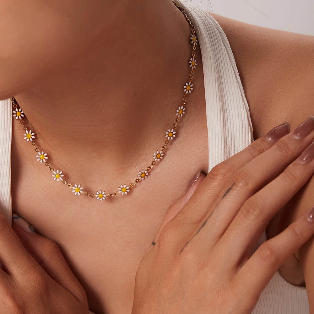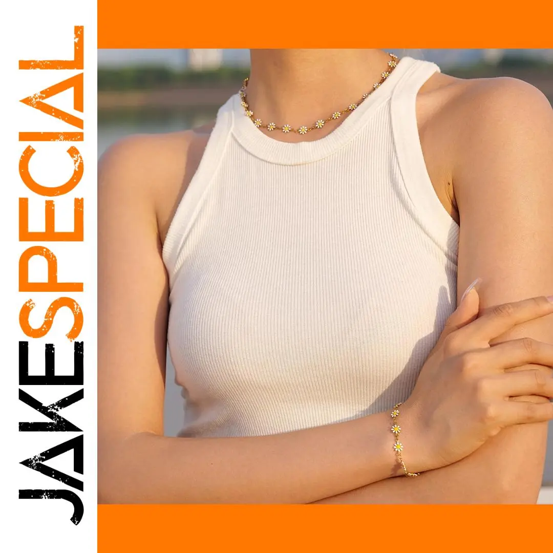 Enhance your style effortlessly with this stunning floral jewelry set, designed to add a cheerful, feminine touch to any outfit. Crafted from high-quality stainless steel, it boasts a shiny PVD golden finish that is both durable and resistant to corrosion. The delicate necklace features small floral charms with white petals and yellow centers, flawlessly spaced to create a charming choker fit. Complemented by a matching bracelet with similar floral motifs, this set offers a harmonious and fresh aesthetic. Whether for daily wear or special occasions, this jewelry set beautifully highlights your neckline and wrist. Its polished finish and delicate design make it a versatile accessory that elevates your look with confidence and style.