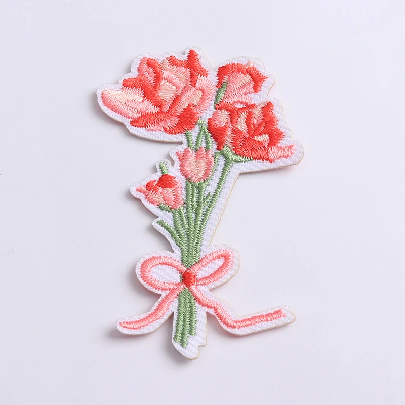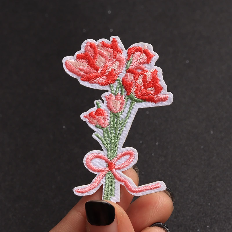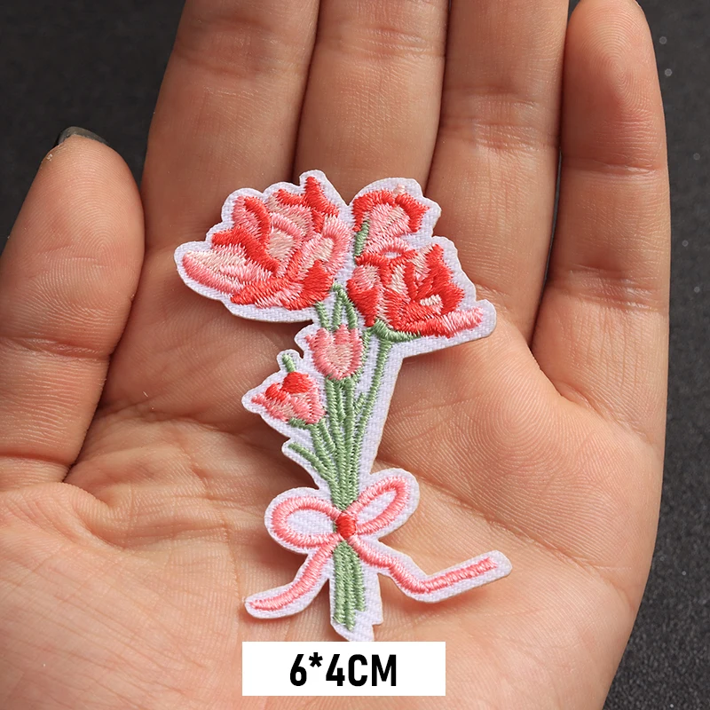 This exquisite flower bouquet embroidered patch measures 6 cm by 4 cm and is designed to enhance any textile with its stunning and cheerful aesthetic. Crafted from durable non-woven fabric, this patch showcases a meticulously detailed embroidery technique that creates a captivating 3D effect. The lush bouquet features vibrant shades of red and pink flowers, delicately intertwined with green stems and leaves, complemented by a charming pink ribbon that adds a touch of elegance. Its eco-friendly materials make this piece both beautiful and responsible, perfect for your DIY projects or as an eye-catching accessory on your favorite clothing items.