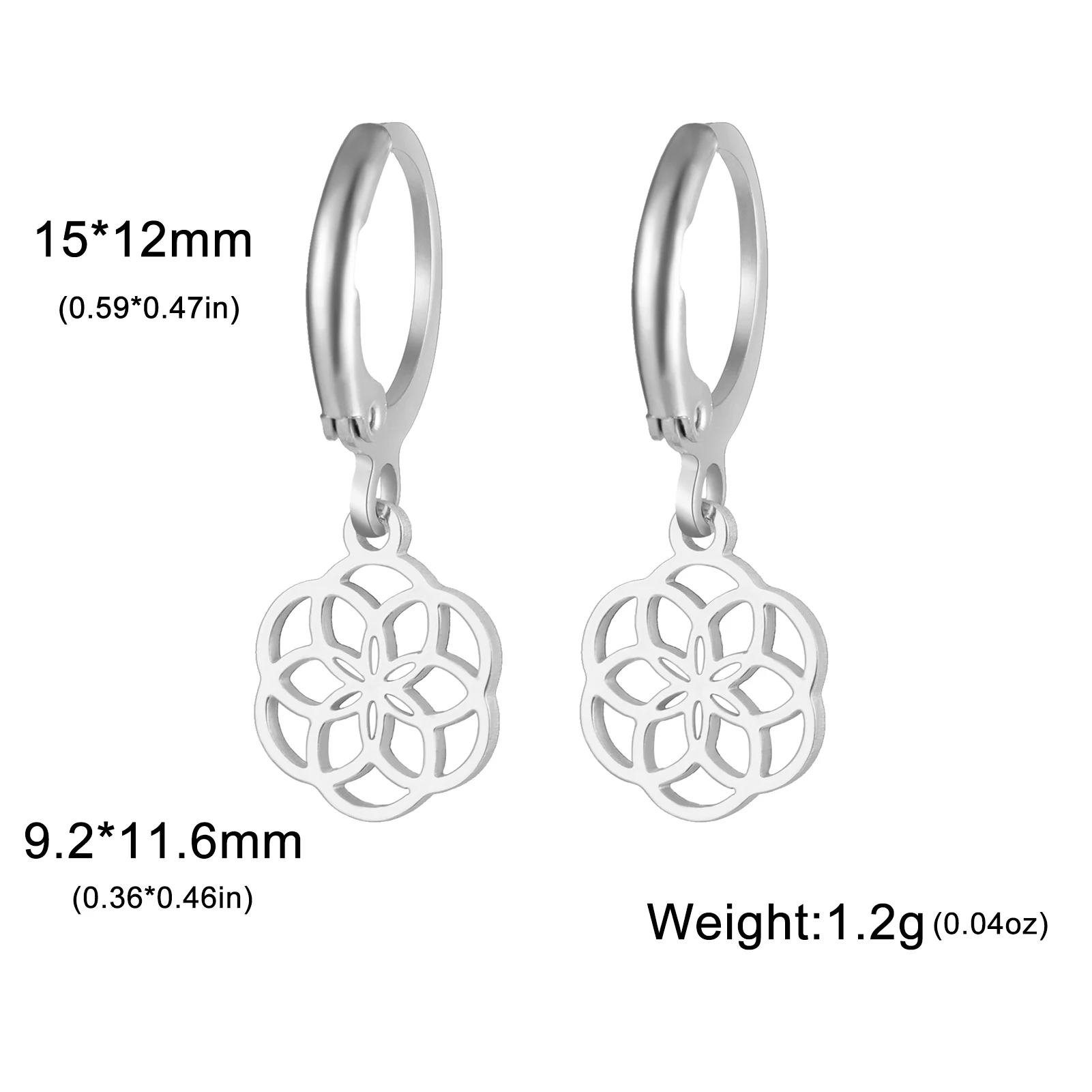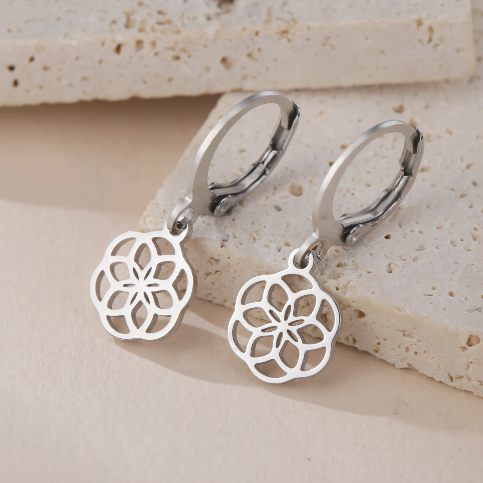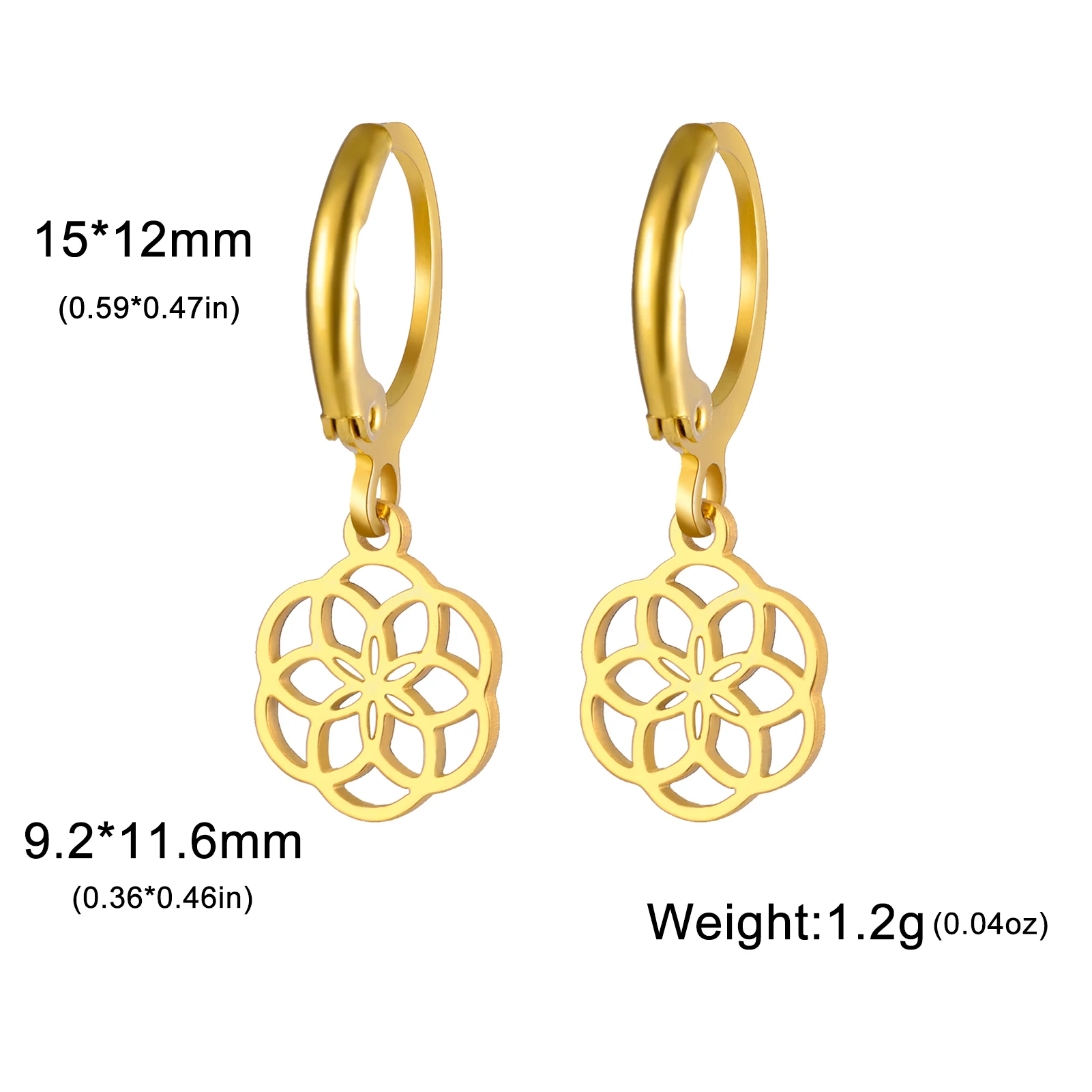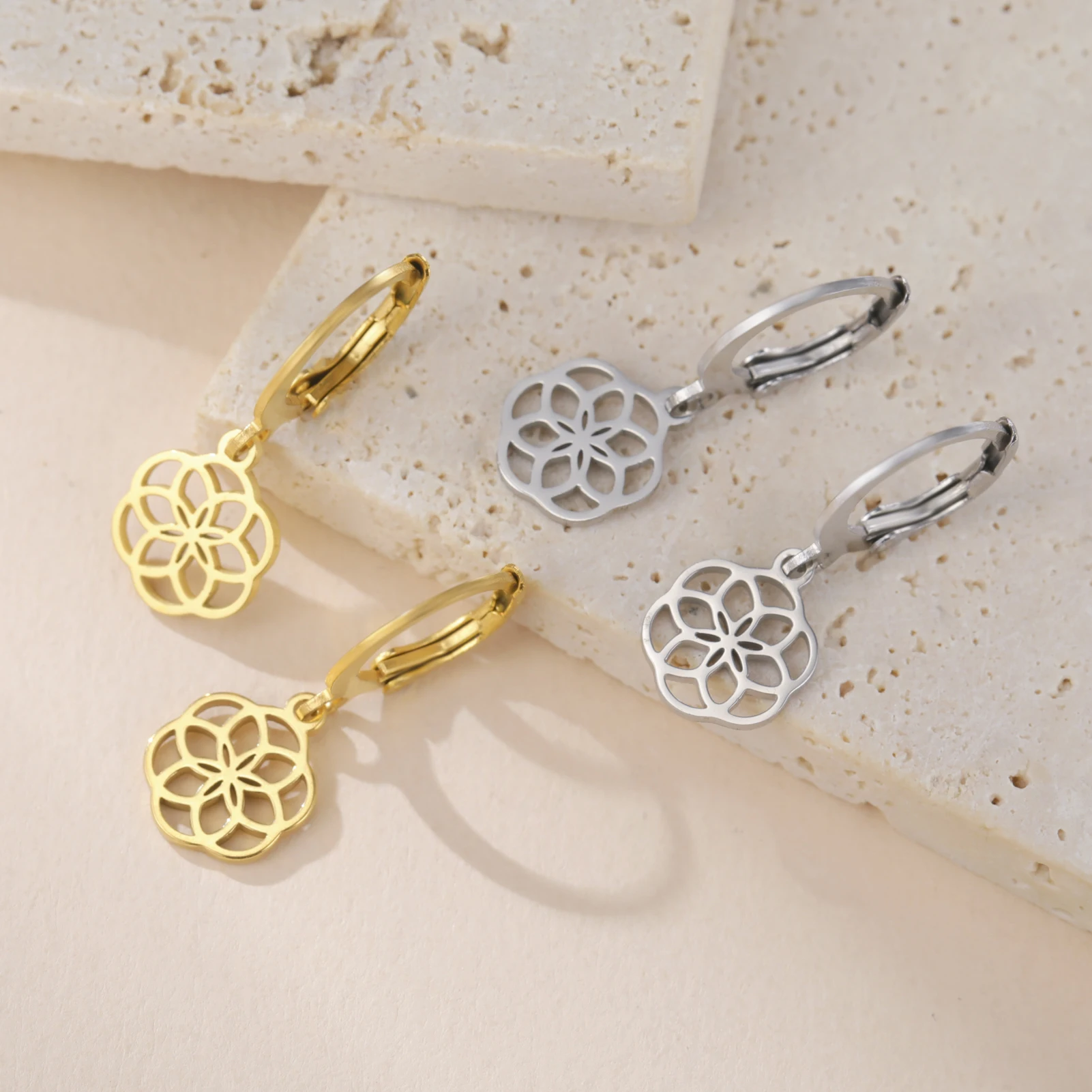Experience the elegance of this pair of drop earrings, beautifully crafted from stainless steel with a sleek, polished finish. Featuring a sacred Flower of Life geometric pattern, these earrings symbolize harmony and interconnectedness, adding a meaningful touch to your jewelry collection. Available in two stunning colors—shiny steel and lustrous gold—these earrings are designed to complement any outfit, from casual wear to special occasions. The lightweight, cut-out design ensures comfort without sacrificing style, making them perfect for everyday wear or festive events. Their reflective surface catches the light beautifully, creating a subtle glow. With clean lines and precise craftsmanship, this jewelry piece combines modern fashion with sacred symbolism, making it an ideal gift or personal accessory for women and girls who love meaningful, trendy jewelry.