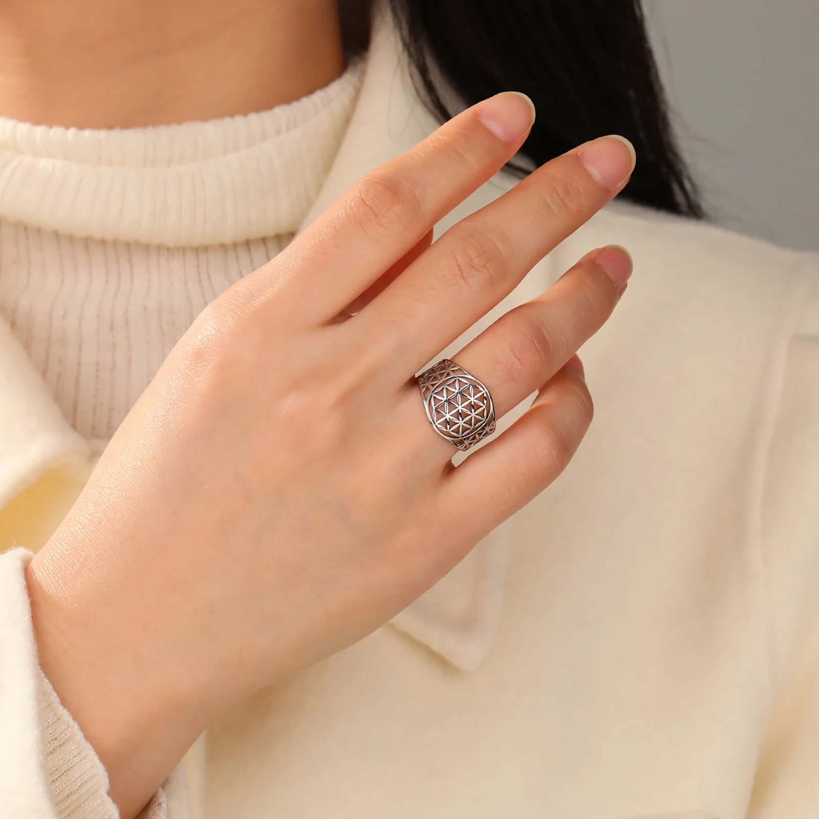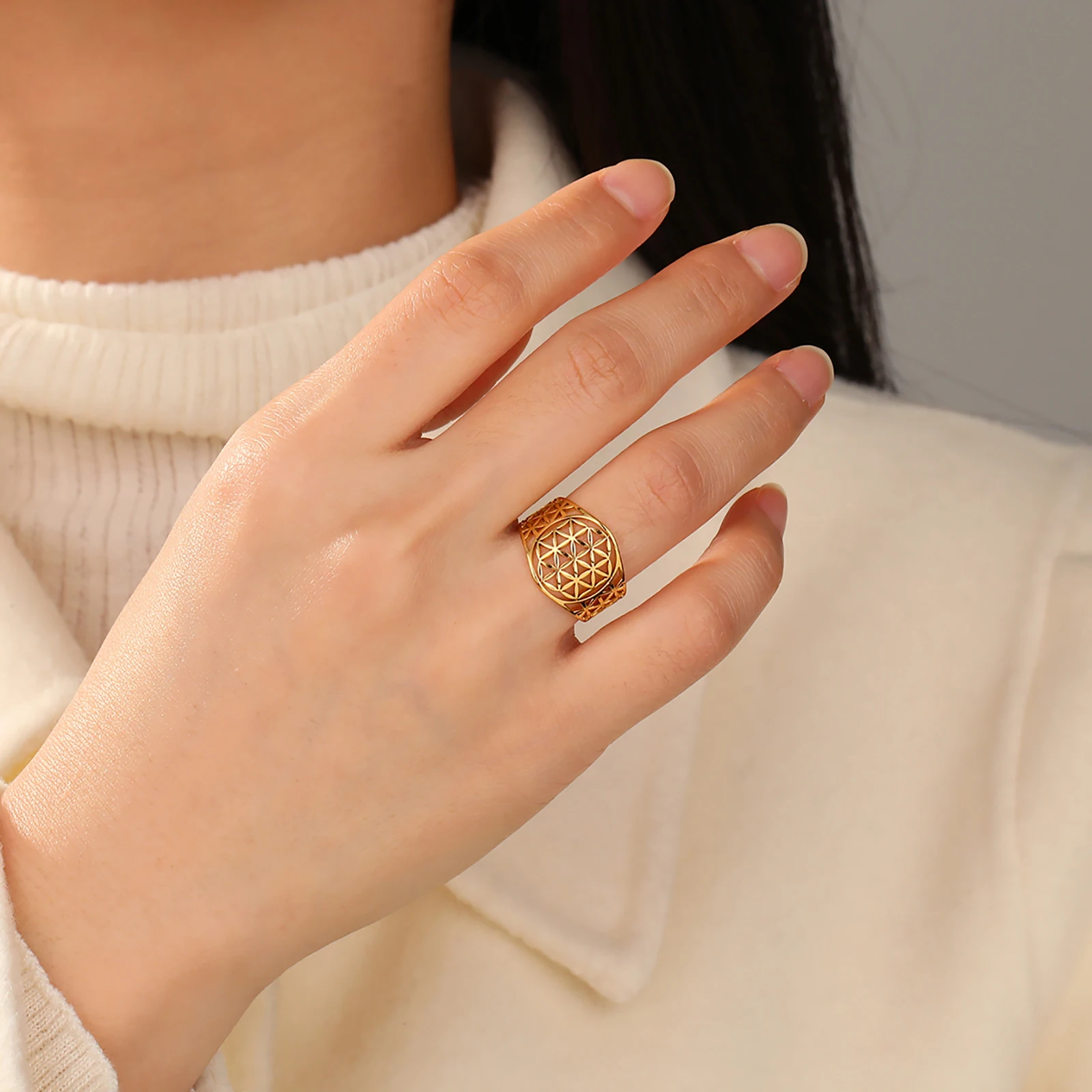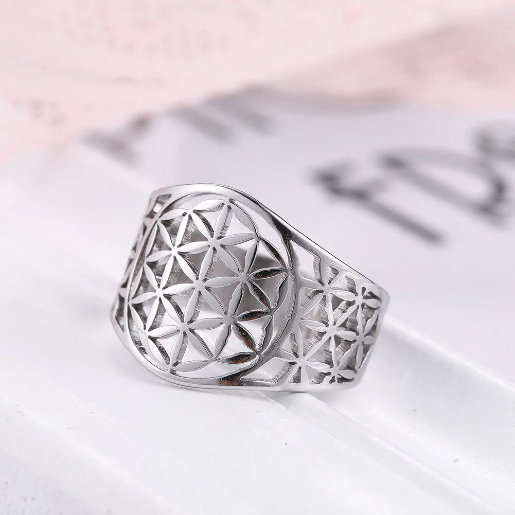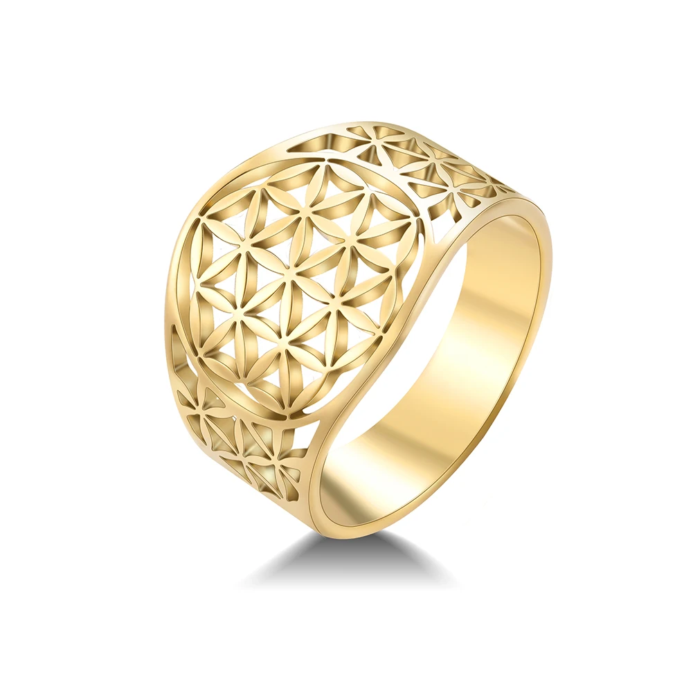 Imagine yourself adorned with this striking Flower of Life ring, a perfect symbol of harmony and sacred geometry. Crafted from durable stainless steel and available with a luxurious 18k gold plating, this wide-band statement piece combines spiritual symbolism with modern fashion. The intricate openwork geometric design, composed of interlocking circles, is sharply detailed, showcasing high-quality craftsmanship. The versatile sizes ensure a comfortable fit, making it ideal for daily wear or special occasions like anniversaries. Its vintage style adds a touch of timeless elegance, while the bold pattern draws attention effortlessly. Whether you choose the sleek steel or warm gold finish, this ring is designed to elevate your look and reflect your unique style with confidence.