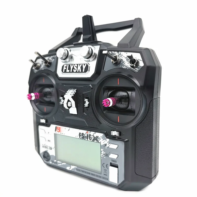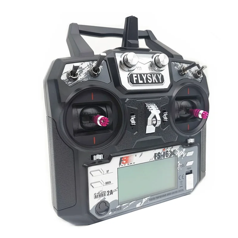 Experience the ultimate in remote control versatility with this Flysky FS-i6X transmitter. Designed for model enthusiasts, it features a sleek black exterior with a robust, ergonomic rectangular shape that fits comfortably in your hand. The large, 128×64 LCD display with a white backlight ensures clear visibility, even in bright conditions. The textured control knobs, in metallic pink, add a vibrant touch and enhance tactile control, while the pair of symmetrical joysticks with pink caps provide precise maneuverability. Equipped with dual short black antennas angled outward, this transmitter offers stable, reliable communication over long distances. Whether controlling drones, helicopters, or gliders, this device combines sophistication with functionality to elevate your flying experience, making each flight more confident and enjoyable.