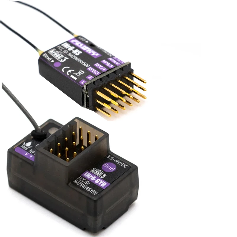 Experience seamless control with these sleek Flysky receivers, INr4-GYB and INr6-HS, crafted for demanding remote-controlled vehicle applications. Crafted from durable black plastic, they feature minimalist, rectangular designs with smooth surfaces and metallic gold-plated pins that offer a polished, professional look. Both models showcase dual antennas approximately 92.5 mm long, connected via IPEX4 interfaces, ensuring stable signal reception over distances greater than 1000 meters. The INr4-GYB measures 17x29x16.6 mm, weighs just 6.5 grams, and offers four PWM channels, while the INr6-HS, smaller at 18×16.8×6 mm and 3 grams, provides six PWM channels. They operate on the robust 2.4GHz AFHDS 3 protocol, supporting multiple data outputs for versatile control options. These receivers enhance your control experience with reliable performance and sophisticated design.