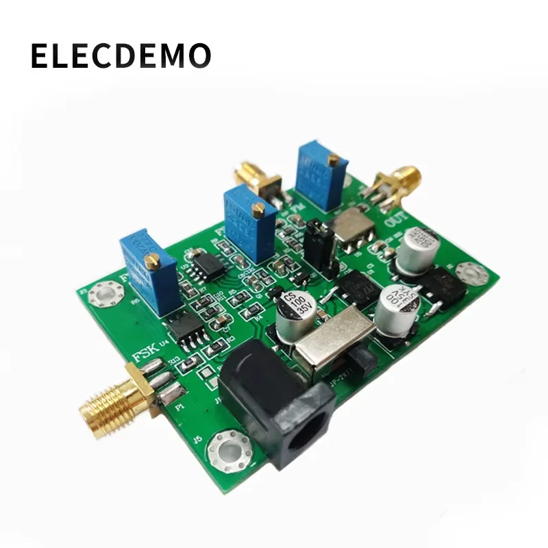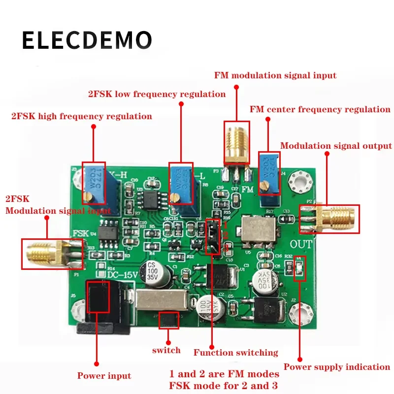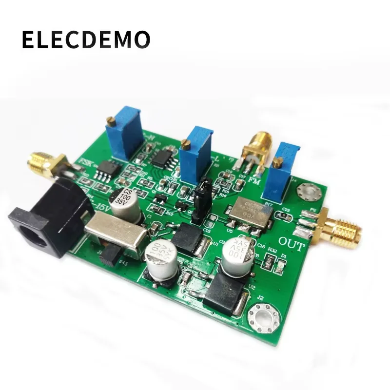 This compact FM modulation module operates with a 15V DC power supply, featuring a 50Ω output impedance and an output power of 3-10 dBm. It covers a center frequency range of 50MHz to 160MHz, with adjustable FM frequencies from 60MHz to 150MHz via a blue potentiometer. Supporting FM signal amplitudes of 0.5-12V peak-to-peak and 2FSK modulation with frequency hopping between 60MHz and 150MHz, it boasts a maximum carrier rate of 300kHz. The module’s size is 64mm by 44mm, with M3 mounting holes 4mm from the edge. Its phase noise at 100kHz offset is ≤ –120 dBc/Hz, and the VCO output is suitable for frequency modulation applications, though not a sine wave.