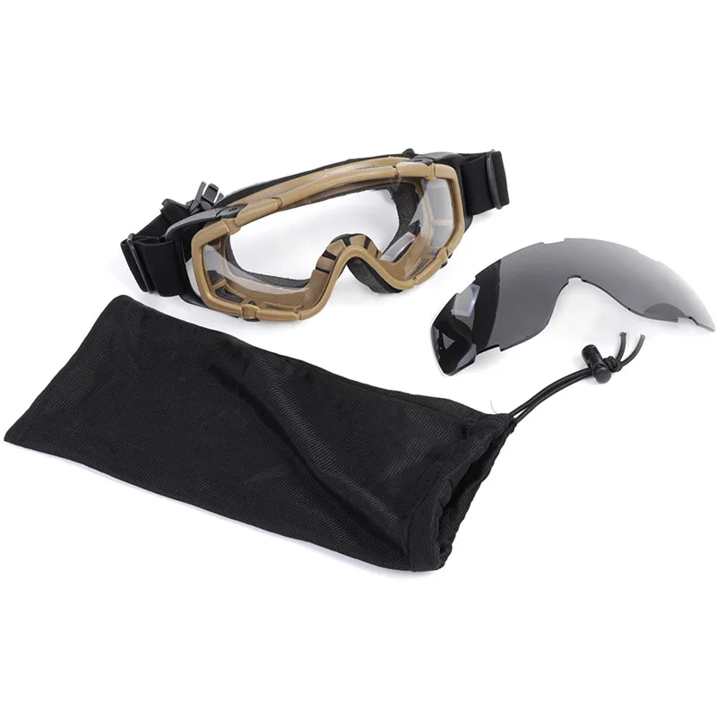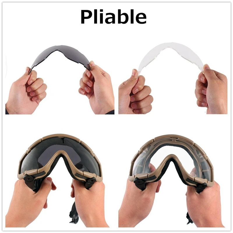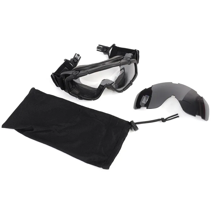 Experience ultimate eye protection with these tactical FMA Helmet Goggles, designed for helmets with side rails and compatible with weapon sights. Crafted from durable TPU frames and impact-resistant polycarbonate lenses, they feature anti-fog and UV-protective coatings for outdoor activities like airsoft, skiing, or cycling. The sleek black or desert color options enhance their modern, tactical look. The goggles come with two interchangeable lenses—clear and dark—along with a protective case and cleaning cloth. Adjustable, non-slip straps ensure a secure and comfortable fit for all head sizes. Weighing only 282 grams, these versatile goggles combine rugged durability with sleek functionality for any adventure.