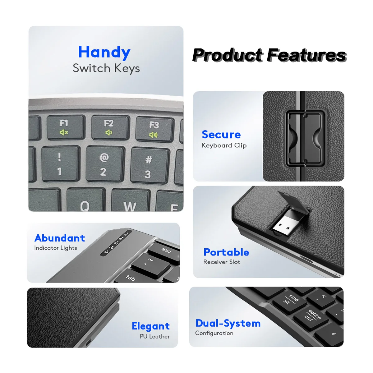 Experience portable convenience with this sleek, black, ergonomic foldable Bluetooth keyboard featuring a 6-row split layout with 80 full-size keys, including 12 shortcut keys for quick access. Weighing only 9 ounces, it connects seamlessly via Bluetooth 5.1 or 2.4G with stable, fast connections and support for three devices. Crafted from wear-resistant PU leather, its modern, ergonomic design with low-profile membrane keys and laptop-like X-shaped scissor switches ensures comfortable, efficient typing. The foldable, split structure minimizes muscle strain and promotes proper posture, making it ideal for business travel, daily use, and productivity on the go. Rechargeable via USB Type-C, it boasts up to 120 days of standby time.