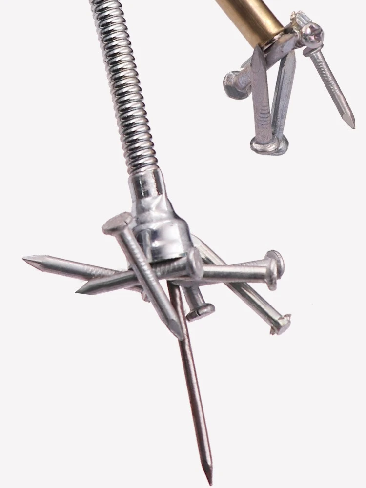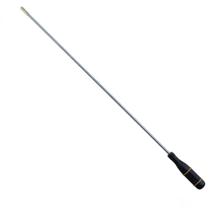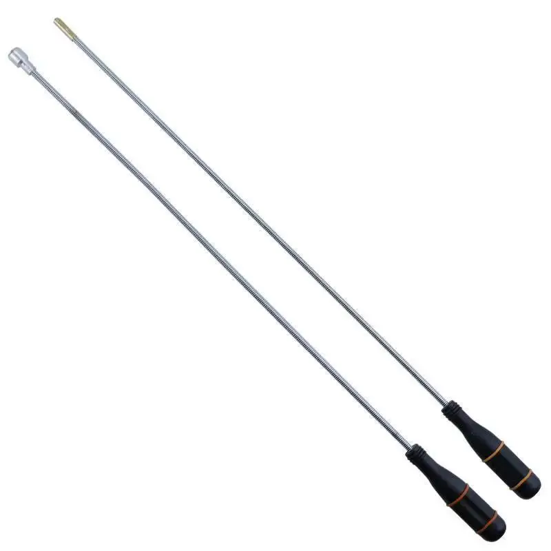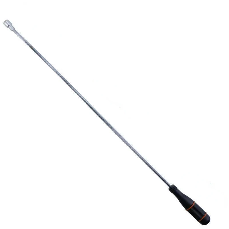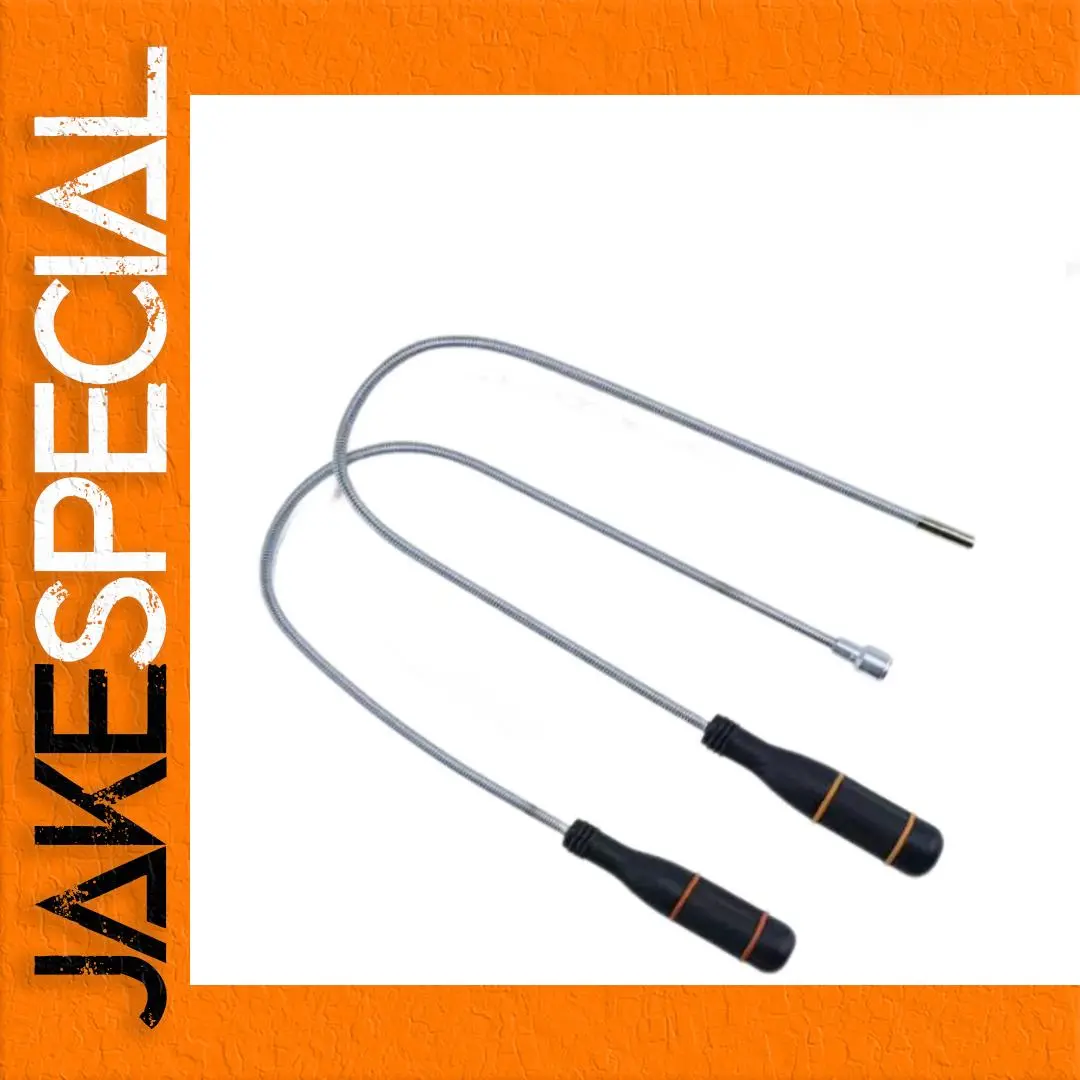 The foldable magnetic pick-up tool is an essential household device, featuring two durable, elongated flexible rods with a shiny stainless steel finish, designed to reach tight spaces effortlessly. It extends from 126 mm to 650 mm and includes magnetic tips with a smooth, rounded design for efficient retrieval of metal items such as nuts, bolts, and screws. The tool operates on 3 AG13/LR44 batteries (included) and is equipped with an ergonomic black plastic handle, accented with an orange detail, ensuring a comfortable grip and enhanced usability for various applications in homes, garages, yards, and offices.
