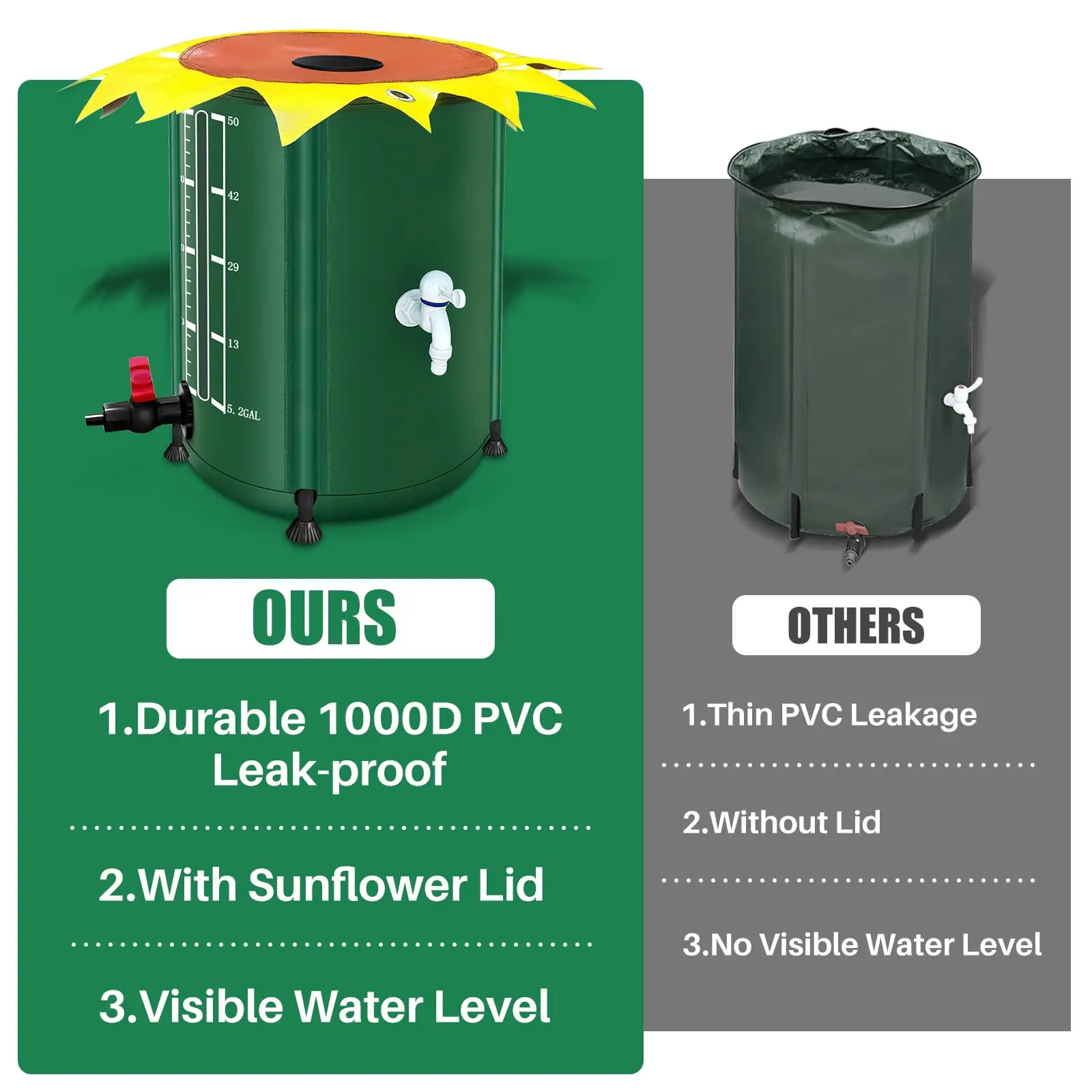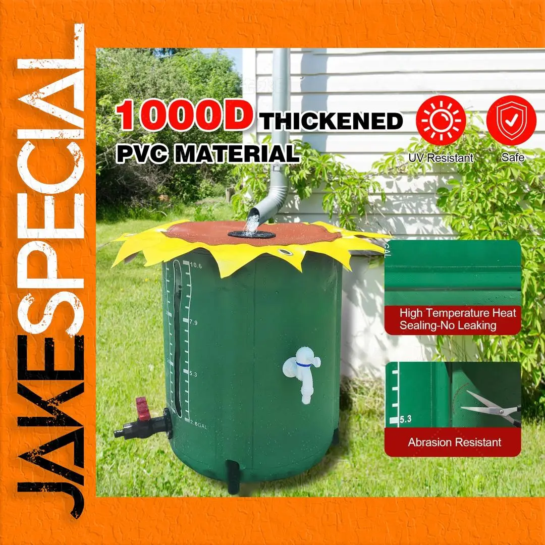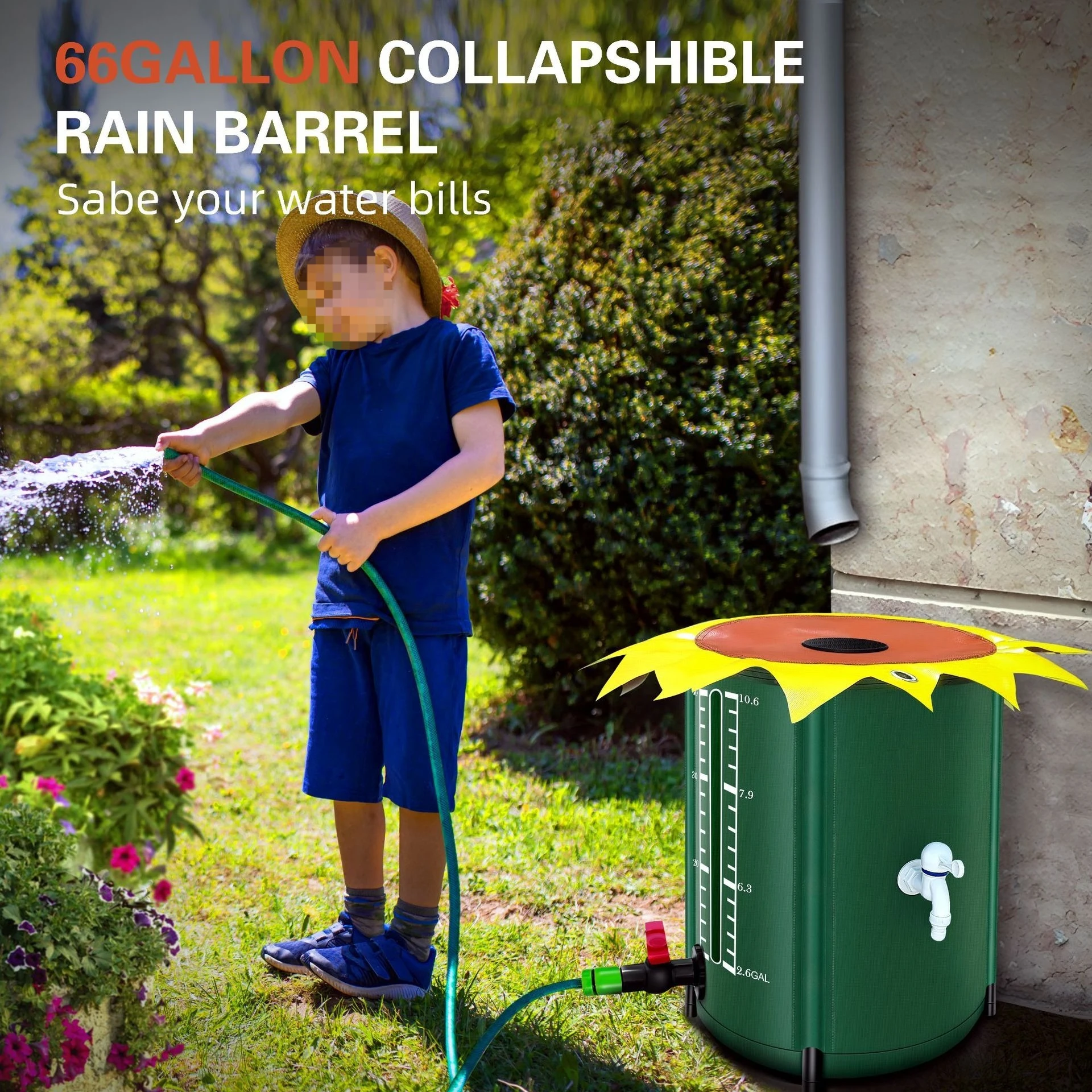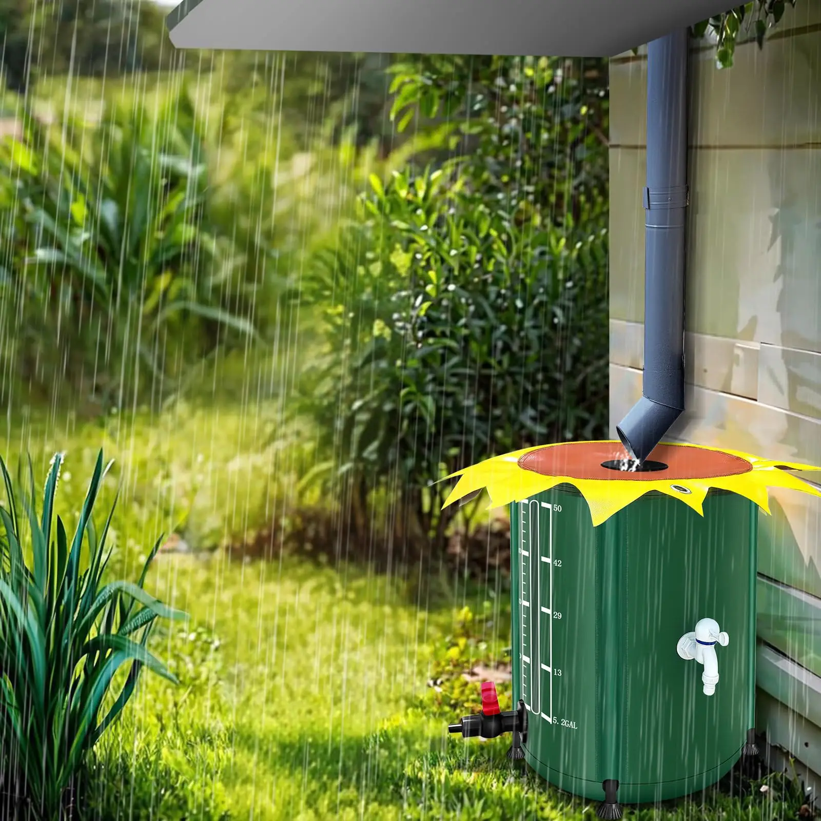 Experience efficient rainwater collection with this durable, eco-friendly collapsible rain barrel. Designed in a sleek green hue, it offers a practical solution for gardeners and outdoor enthusiasts. Constructed from thick PVC, it withstands the elements, ensuring long-lasting performance. Its space-saving foldable design makes storage easy when not in use, perfect for portable needs like camping or outdoor projects. The barrel features a clear capacity scale for monitoring, along with a sturdy base to prevent tipping. An attractive yellow leaf-shaped mesh lid prevents debris entry, while the spigot and overflow kit with rubber rings guarantee leak-proof operation. Simplify your water collection—invest in this reliable, reusable rain barrel today.