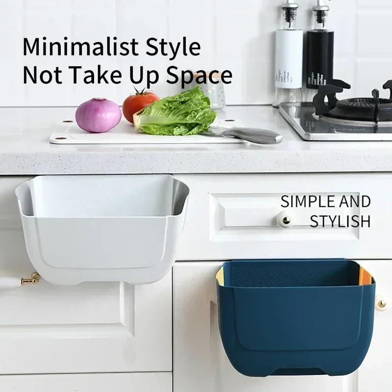 Imagine having a sleek, space-saving trash solution that seamlessly fits into your kitchen or office. This wall-mounted, foldable trash can measures 21 cm in length, 14 cm in width, and 8 cm in height, weighing only 380 grams. Crafted from durable, waterproof plastic with PP and TPR materials, it boasts a glossy finish that is easy to clean and maintains a modern look. The vibrant blue with yellow accents or the neutral white color complements a variety of interior styles. Its innovative design allows it to hang securely on cabinet doors up to 2.6 cm thick, or stand alone on the floor, providing maximum flexibility. When not in use, simply fold it inward to save space, making it ideal for busy kitchens, dorm rooms, or outdoor settings.