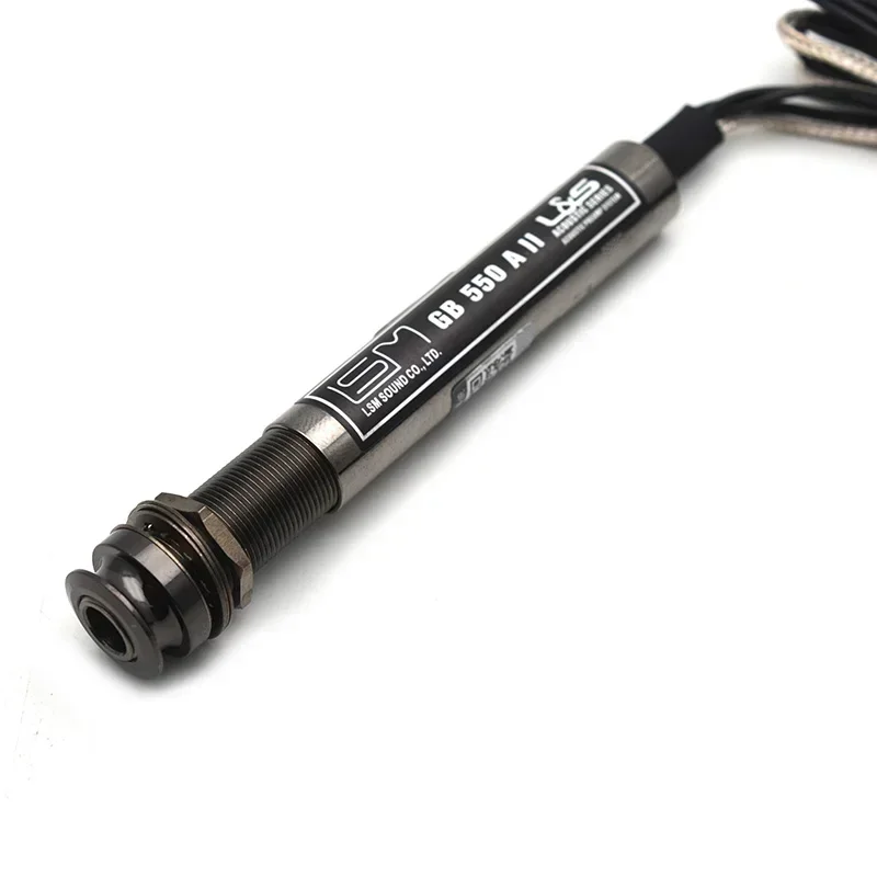 Experience superior sound quality with this meticulously designed pen-style pickup system for folk and classical guitars. Weighing just 146 grams, it offers a lightweight yet durable metal construction, ensuring stability during performances. The device features a modern, streamlined black body accented with shiny metallic ends, providing an elegant and professional aesthetic. Its compact cylindrical shape fits snugly into your guitar's sound hole, while the attached cables, neatly coiled and secured with a black cable tie, emphasize portability and ease of handling. The small black control box with a chrome finish allows for simple volume and tone adjustments, giving you precise control over your sound. Enhance your playing with this high-quality, reliable preamp system that promises clarity and excellence in every note.