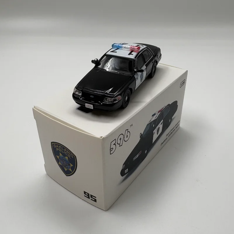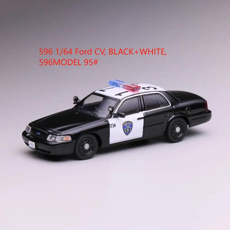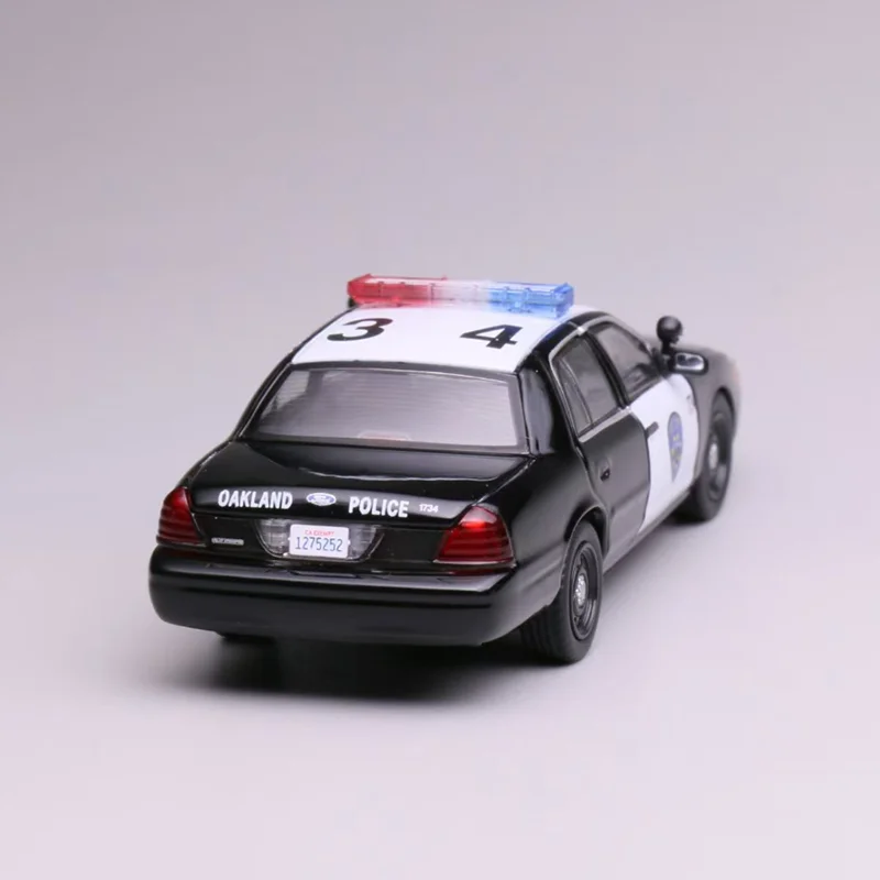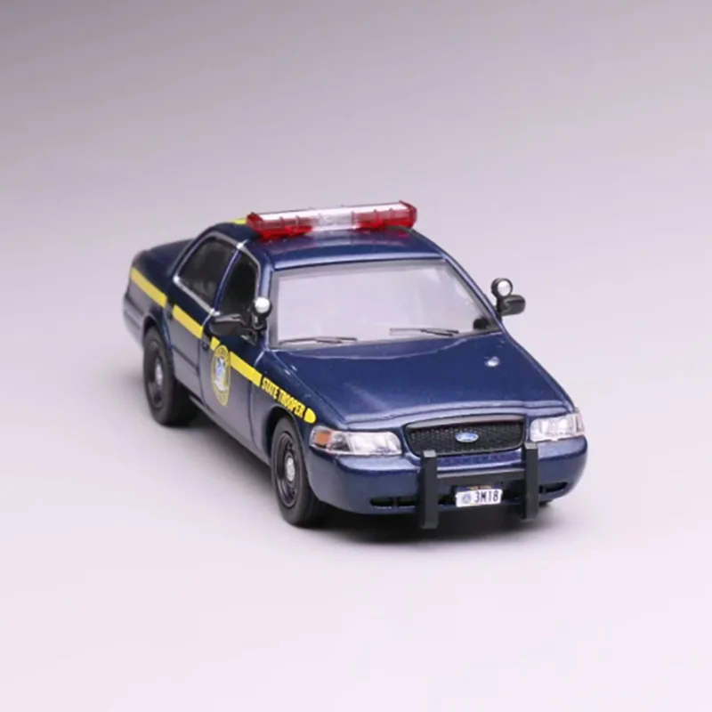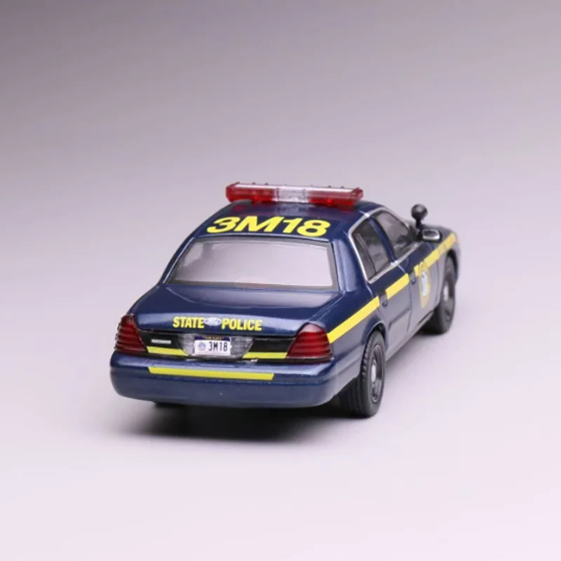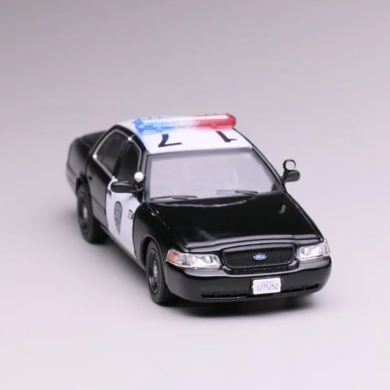 The Ford CV California 1:64 scale diecast model car showcases two meticulously designed police vehicles. The top model features a striking black and white color scheme with vibrant red and blue emergency lights, a detailed front grille, clear plastic headlights, and a California license plate numbered “1275262.” The bottom model sports a dark blue finish with a bold yellow stripe, embodying a state trooper vehicle with matching lights and a front push bar, complete with a license plate reading “3M18.” Crafted from a durable combination of alloy and plastic, these models are perfect for collectors and static display, emphasizing intricate details and a smooth finish.
