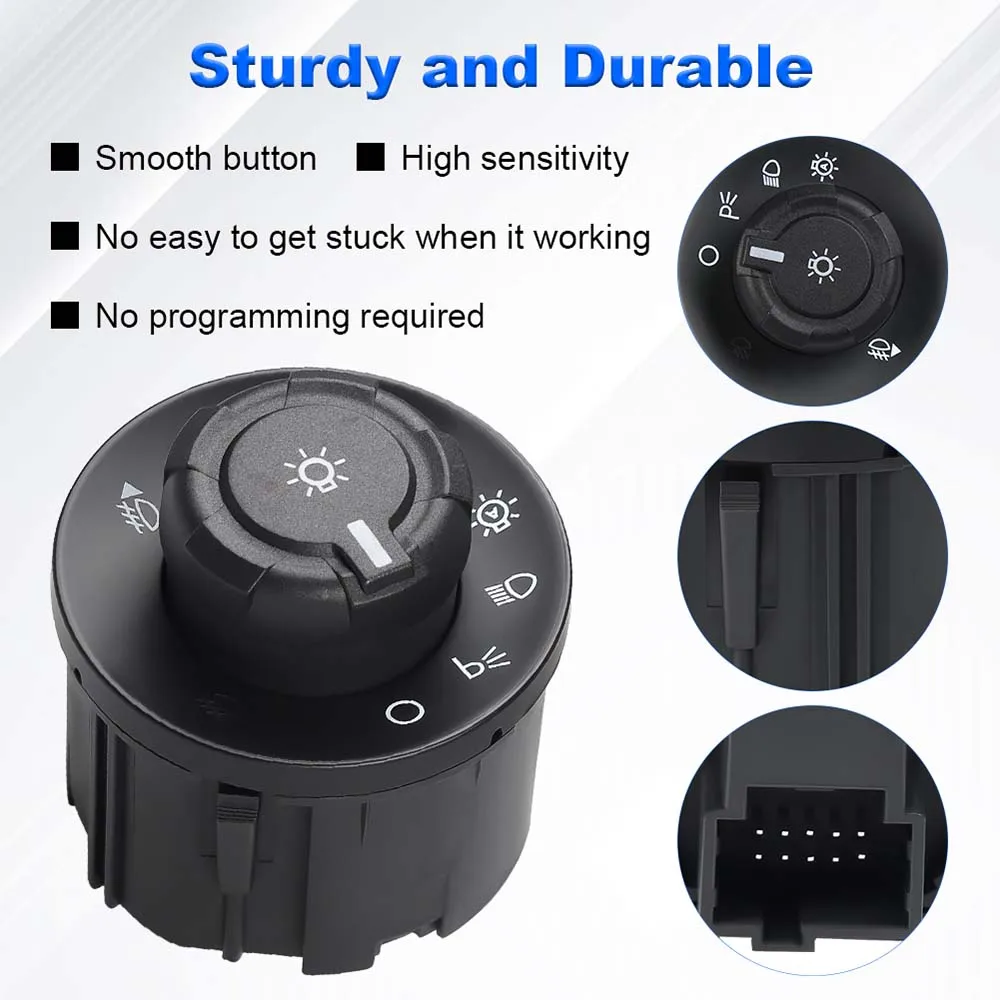 Experience seamless control over your vehicle's lighting with this durable and sleek fog light control switch, designed specifically for Ford F150, F250, F350, F450, and F550 Super Duty models from 2009 to 2016. Crafted with high-quality, heat-resistant plastic, this switch features a modern, matte black cylindrical design with a textured top dial for easy grip and precise adjustments. The prominent, sharply printed white icons clearly indicate functions such as fog lights, parking, and headlights, ensuring effortless operation. Its minimalist and ergonomic appearance integrates seamlessly into your dashboard, providing both style and functionality. Whether you’re replacing an old switch or upgrading, this switch offers reliable performance and a professional look, making your driving experience safer and more intuitive with every use.