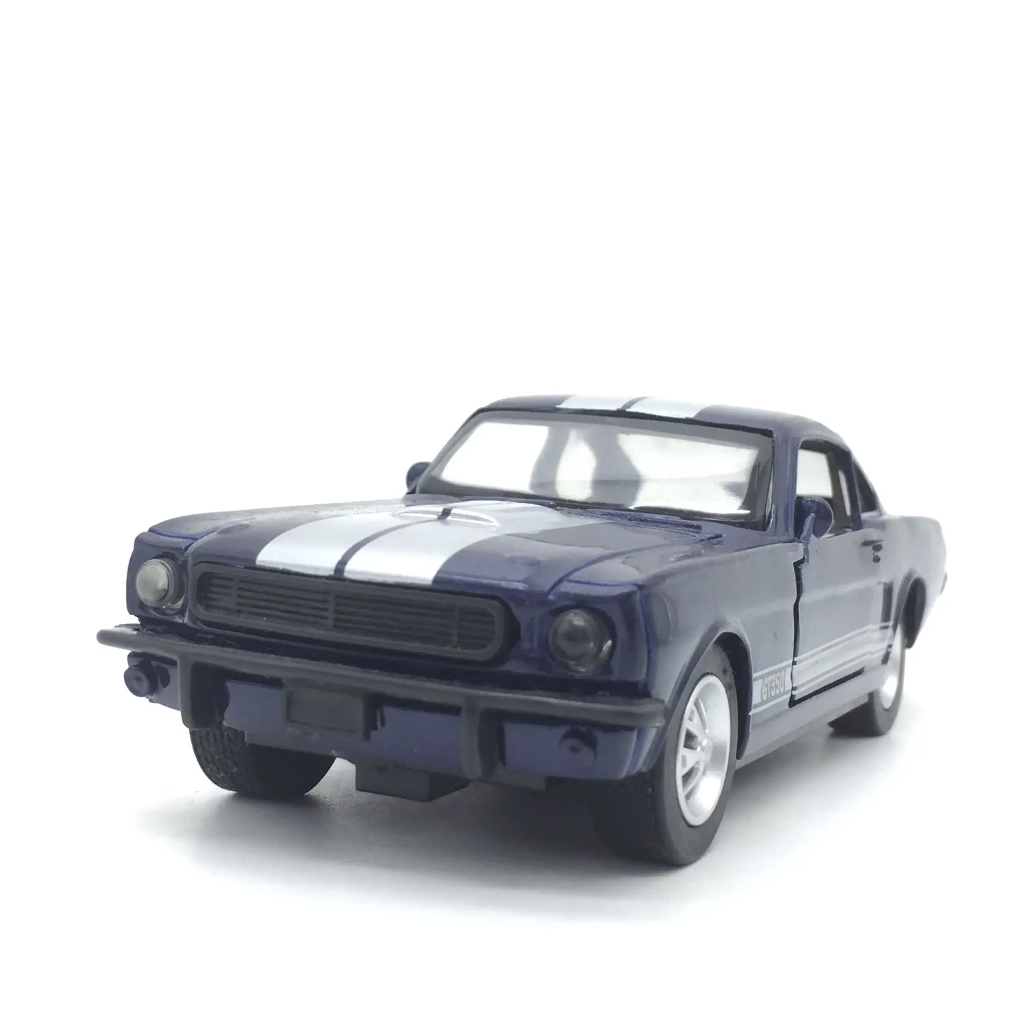 Experience the thrill of high-performance racing with this meticulously crafted 1/32 scale diecast model of the Ford Gt350, measuring approximately 14 cm in length. Made of durable metal, this non-electrical display piece features a sleek, aerodynamic design with a glossy dark blue finish, accented by silver or gray racing stripes along the hood, roof, and trunk. Realistic details include a well-defined front grille, round headlights, clear windows revealing a minimalist interior, and multi-spoke silver wheels with black tires. Perfect for collectors and enthusiasts, this model captures the essence of speed and style, making it an impressive addition to any display.
