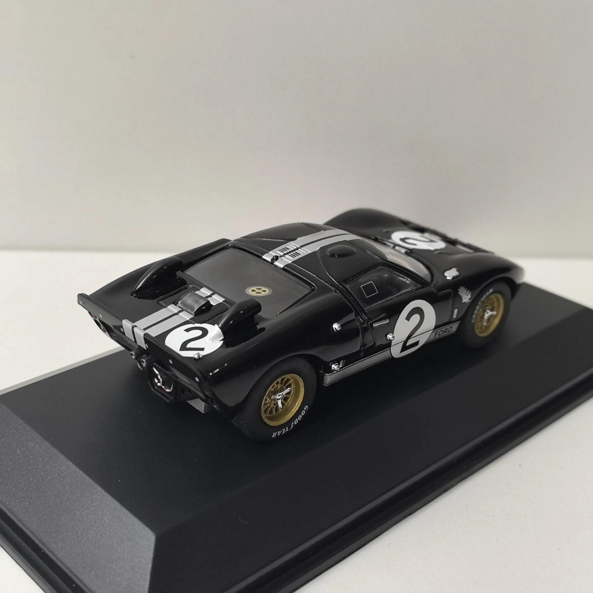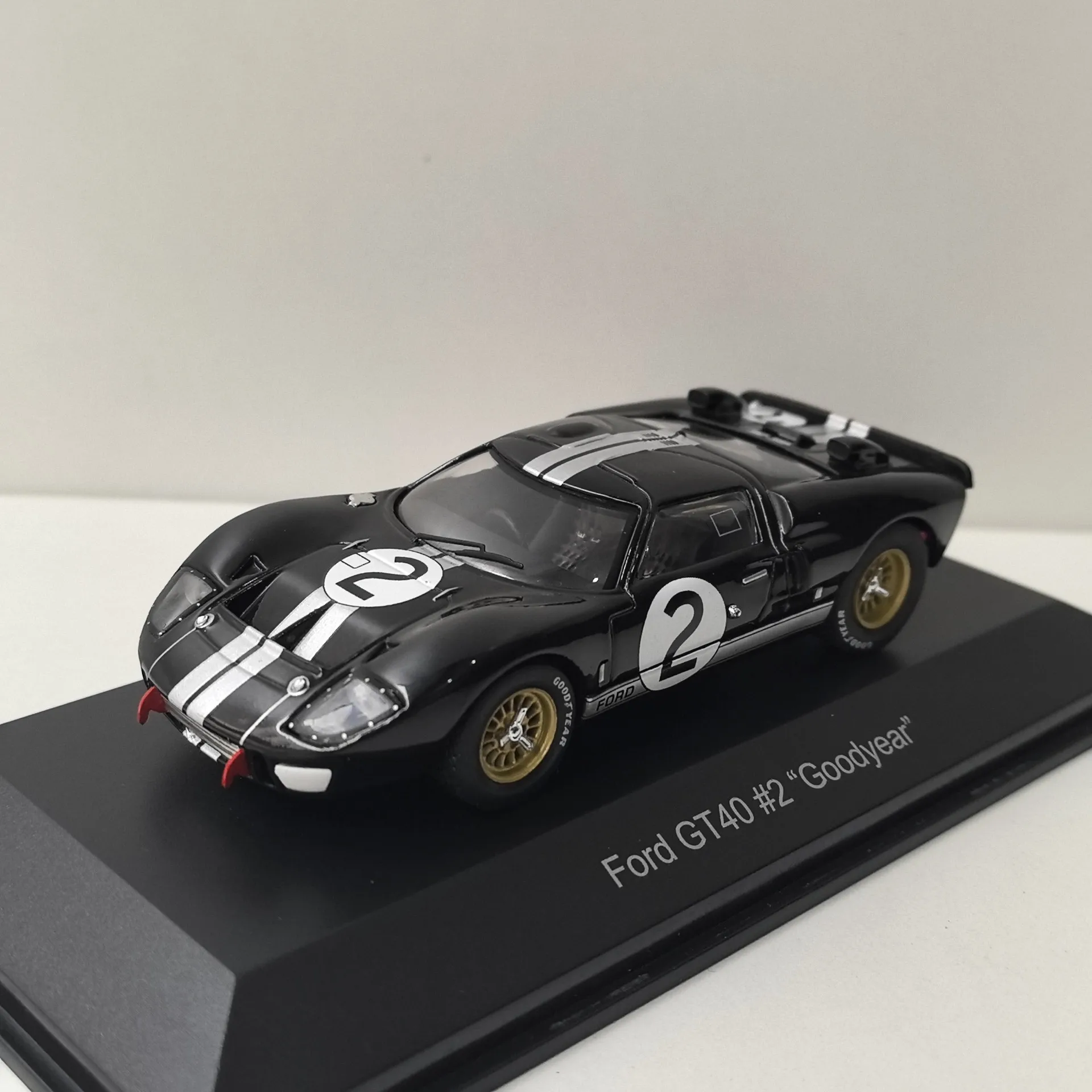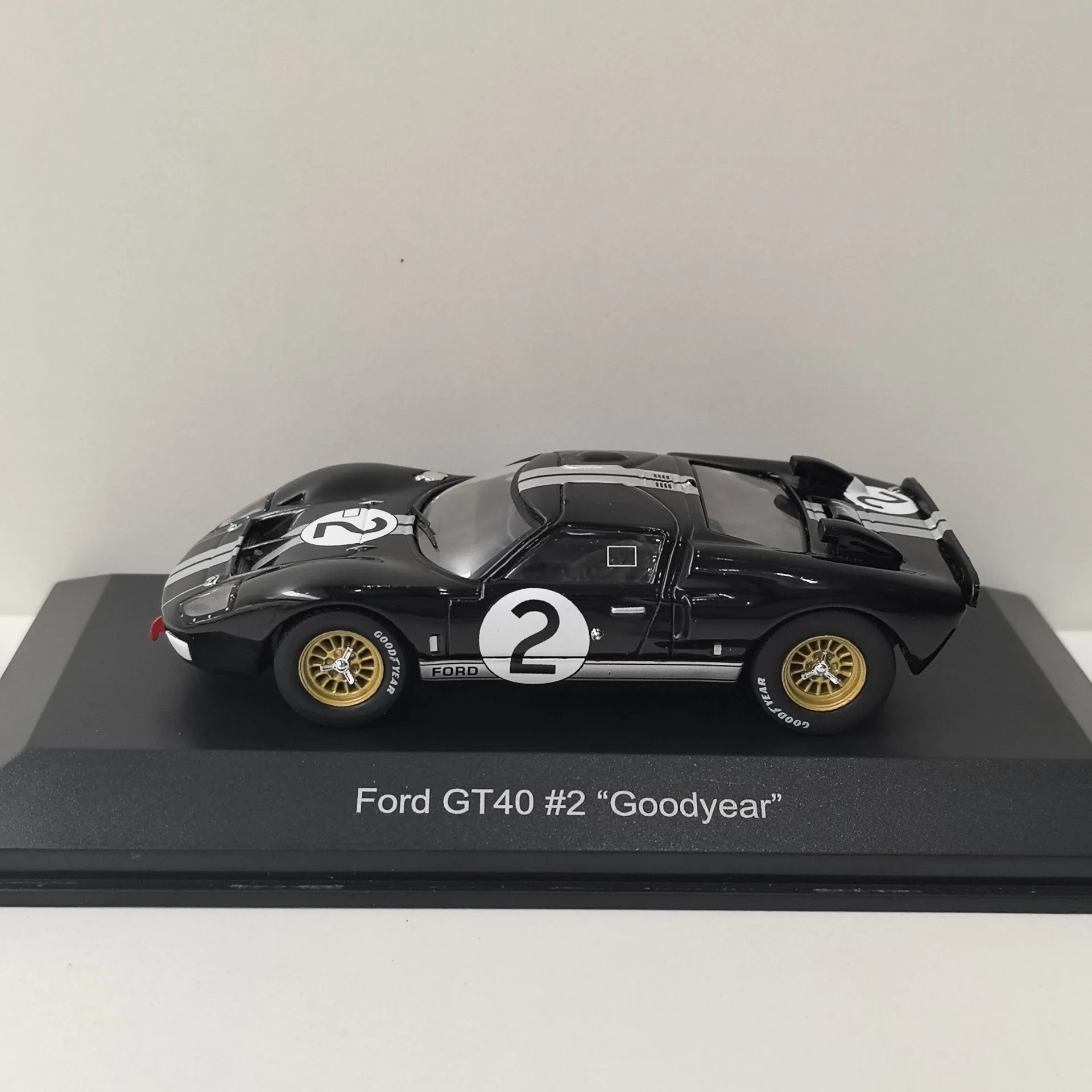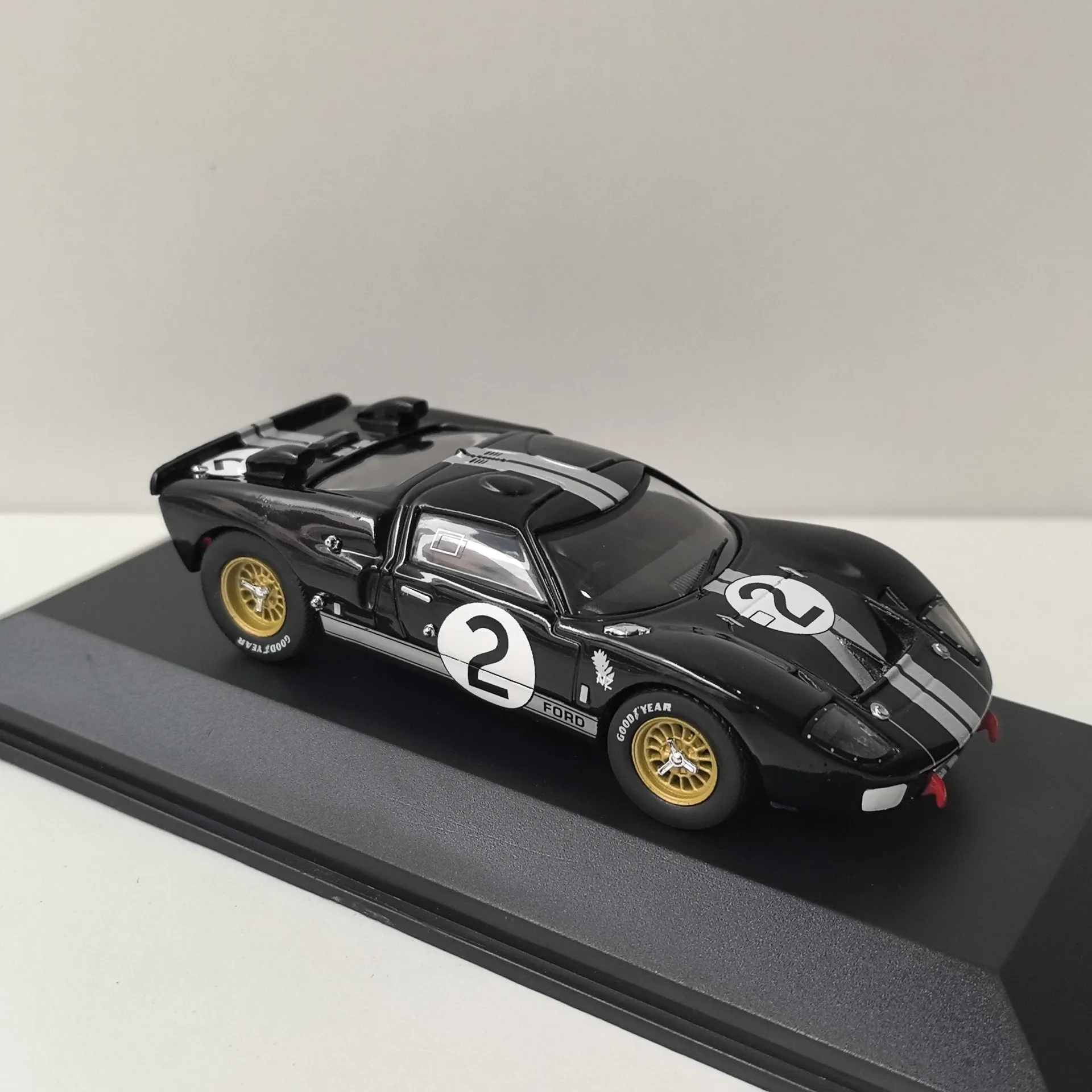 Experience the thrill of vintage racing with this meticulously crafted 1:43 scale diecast model of the Ford GT40 #2. Made from high-quality alloy, this collectible captures the iconic racing car’s sleek, aerodynamic shape. The black body is accented by bold white racing stripes along the center, emphasizing its vintage muscle and racing heritage. Features include clear, well-defined headlights seamlessly integrated into the bodywork, realistic rear vents and air intakes, and gold-colored multi-spoke wheels with detailed tread tires that rotate freely. The model displays authentic decals, including the “FORD” branding and racing number 2 inside a white circle, set on a sturdy display stand with a “Ford GT40 #2 ‘Goodyear’” label. It’s an ideal addition to any collection, offering both aesthetic appeal and sentimental value.