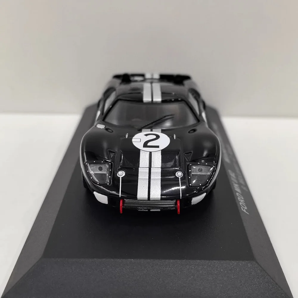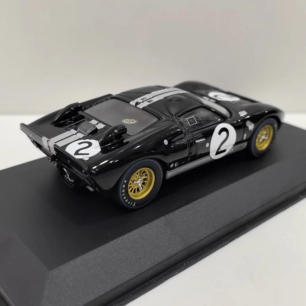 Imagine adding a touch of racing history to your collection with this meticulously crafted Ford GT40 MK II #2 from the 1966 Le Mans race. The sleek, aerodynamic body is finished in a deep black glossy coating, beautifully accented by bold white racing stripes that run the length of the car. Prominent white circles with the number “2” sit on each side and on the hood, enhancing its authentic racing look. The model features highly detailed gold-colored multi-spoke wheels with textured rubber tires, and transparent windows and headlights contribute to its realism. This alloy and plastic masterpiece exudes craftsmanship and passion for motorsport, making it a captivating display piece for any enthusiast or collector.