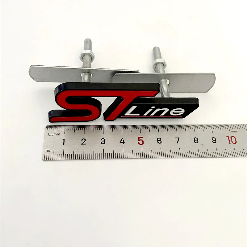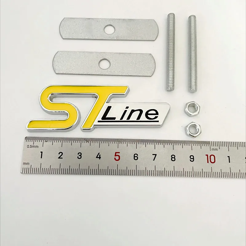 - Designed with a 3D metallic appearance featuring prominent, raised “ST” lettering and a small “Line” inscription for a modern, sporty look that catches light with a glossy, reflective finish.