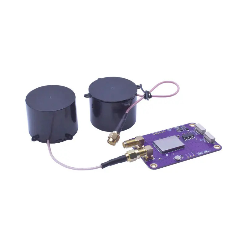 Experience high-precision positioning with this innovative GNSS module assembly, featuring a striking purple PCB combined with sleek black spiral antennas. The compact, rectangular design, measuring approximately 15cm in length, is both modern and professional, perfect for UAV applications requiring centimeter accuracy. The surface-mounted components and white SMA connectors highlight technical sophistication. The four-arm spiral antennas are designed for optimal signal reception while adding visual intrigue through their intricate structure. With a smooth matte finish, this assembly embodies a blend of aesthetic appeal and cutting-edge technology, making it an ideal choice for enthusiasts and professionals seeking reliable, high-performance satellite navigation solutions.