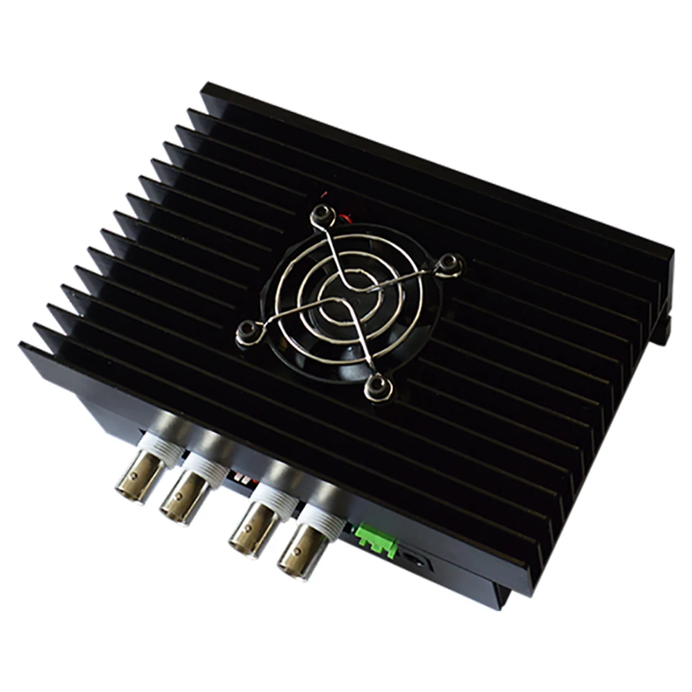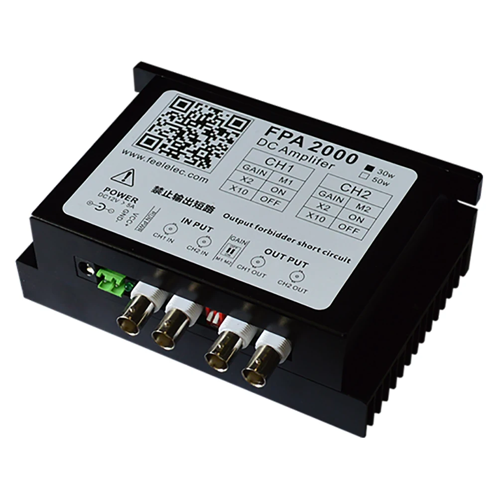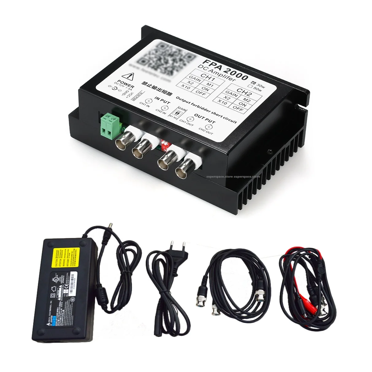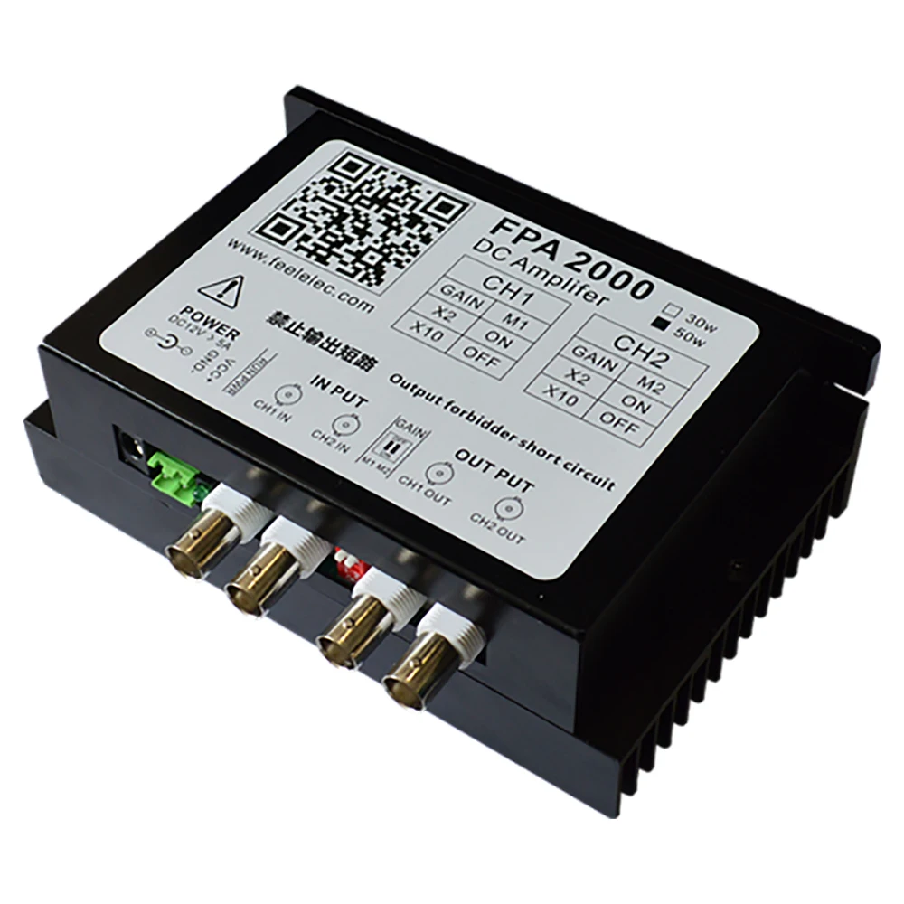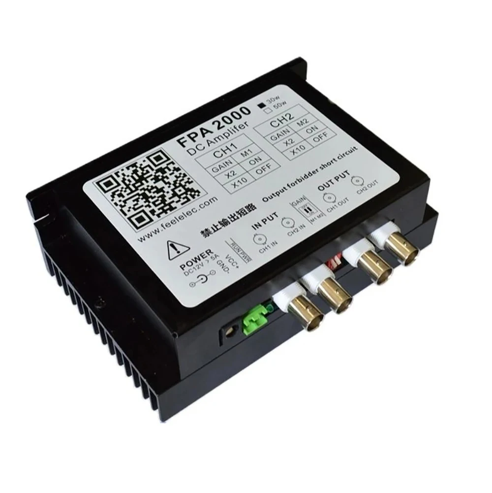 Experience precise and reliable signal amplification with this this FPA2000 dual-channel DC power amplifier. Designed for high stability and low distortion, it provides outstanding performance across a broad frequency range from DC to 100 kHz. Its compact and sturdy black aluminum alloy casing ensures portability and durability, making it ideal for outdoor applications. Featuring a simple yet effective design, the top label displays detailed specifications, enhancing its professional appeal. The front panel hosts two vibrant green terminal blocks alongside four sleek BNC connectors, ensuring seamless connectivity. A small red switch or terminal adds functionality without cluttering the esthetic. This amplifier adapts effortlessly to your projects, delivering clean, high-precision signals for various testing, driving, or experimental needs, empowering you to maximize your setup’s potential.