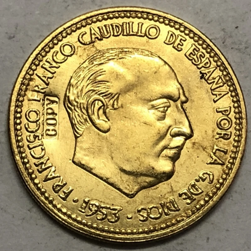 This detailed replica coin, crafted from metal using casting techniques, evokes the antique European style of the 1940s-1950s. Featuring a portrait of Francisco Franco facing right, it measures approximately 2.5 pesetas from 1953. The coin’s polished surface showcases crisp, textured details, including a beaded border and an inscription reading “FRANCISCO FRANCO CAUDILLO DE ESPAÑA POR LA G DE LAS,” completing its vintage aesthetic. Designed strictly for decorative and collection purposes, this coin offers a refined antique appearance, perfect for history enthusiasts or collectors seeking an authentic-looking replica of a significant period.