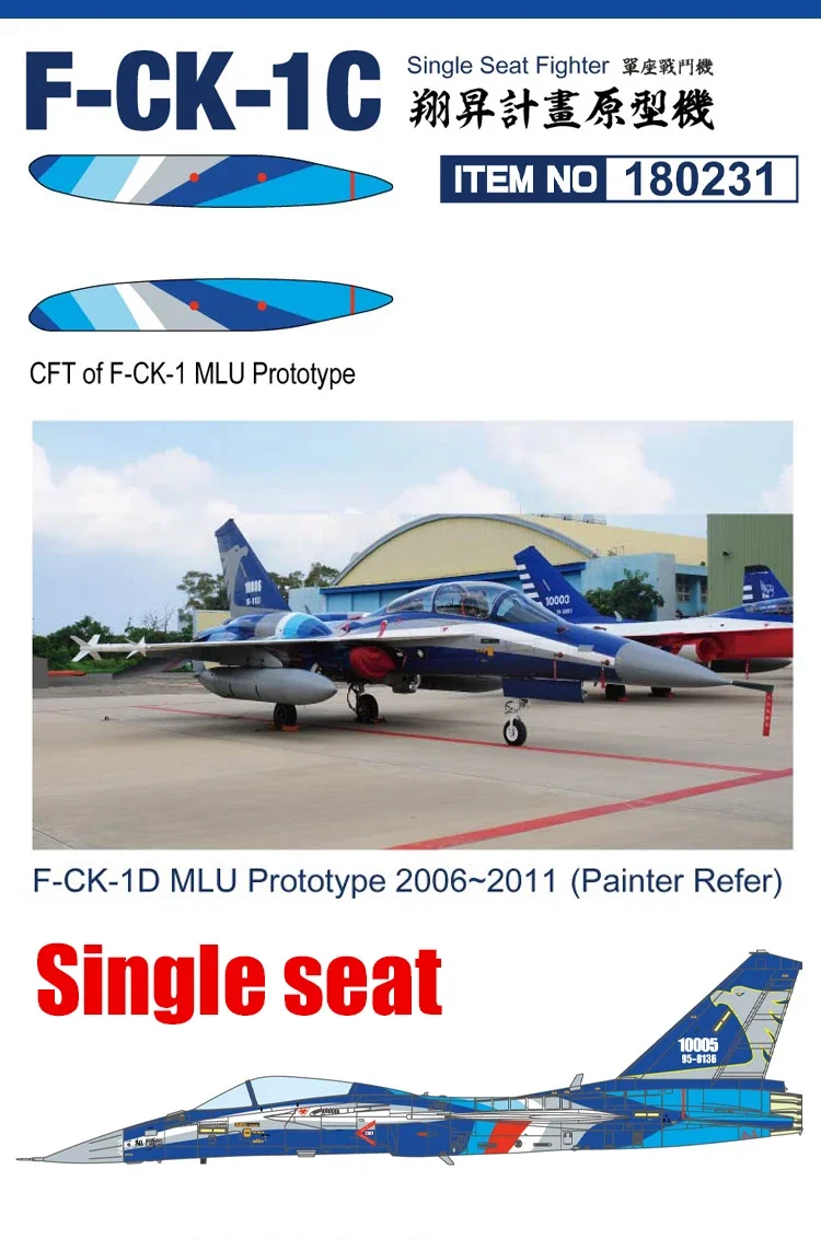 The Freedom Assembling Model Kit 180231 F-CK-1 C “Sheng Hsiang Project prototype” is a highly detailed 1/48 scale model of a single-seat fighter aircraft. Crafted from high-quality plastic, this model features a striking blue color scheme with white and grey accents. It includes essential components like a metal airspeed tube, body coating cover sticker, water sticker, and an etching sheet. Additionally, the kit is equipped with a CFT compatible fuel tank along with air defense options including Tianjian 1+2 and ground defense with the Xiongfeng II/Wanjian weapon group, ensuring an authentic and captivating building experience.