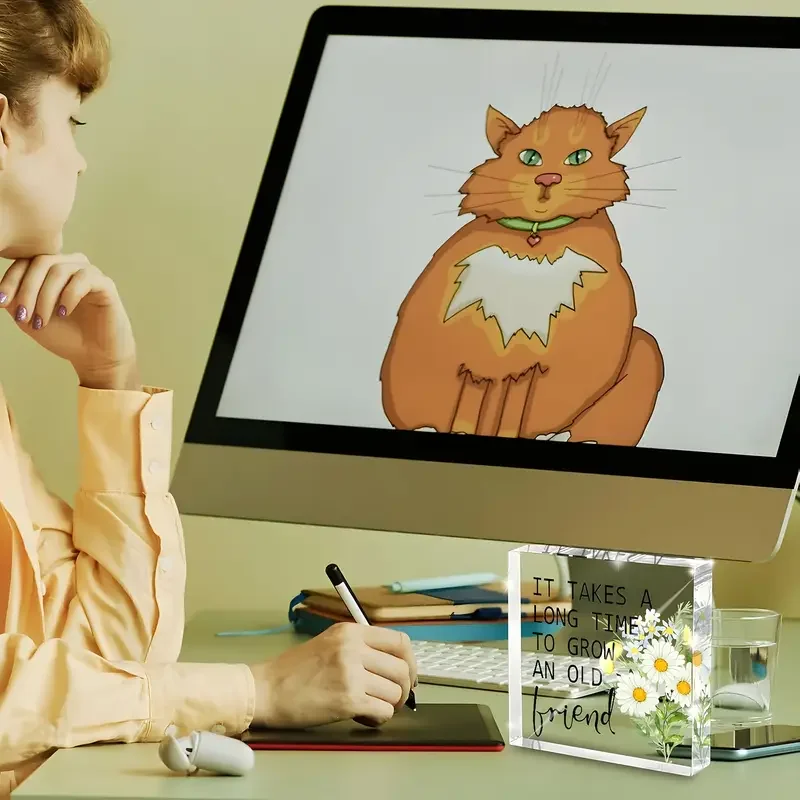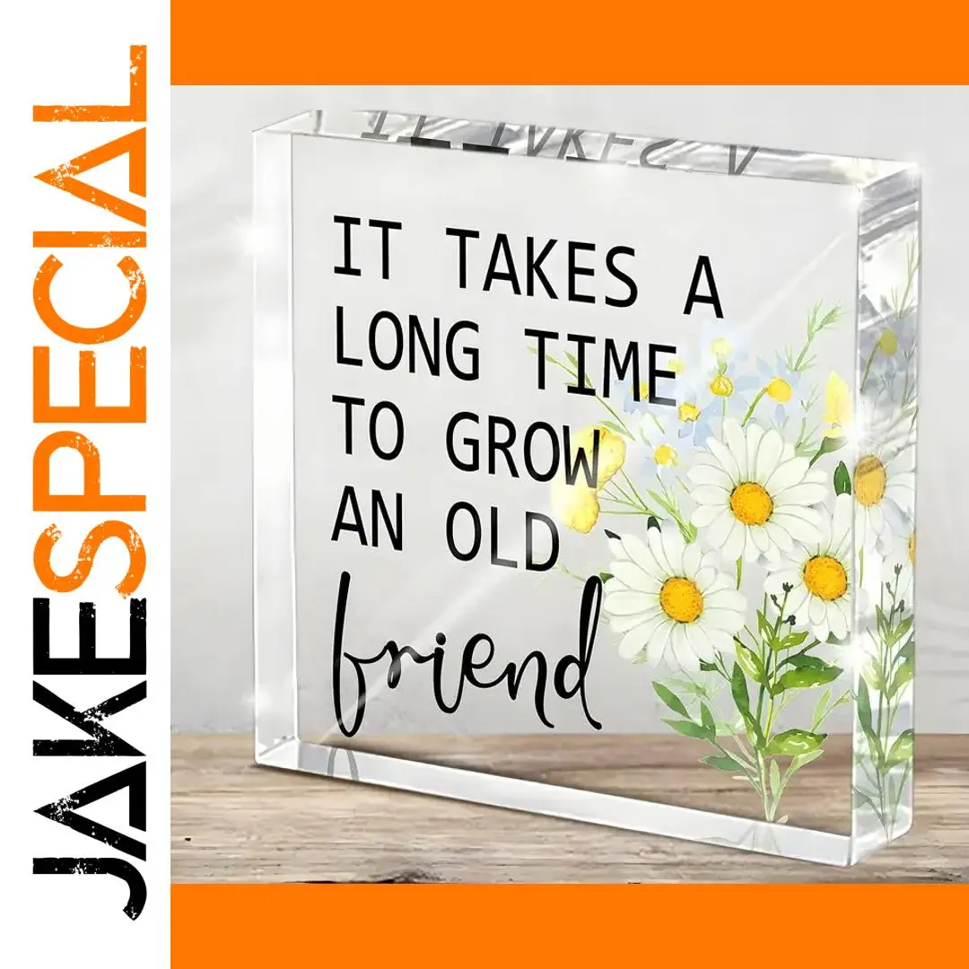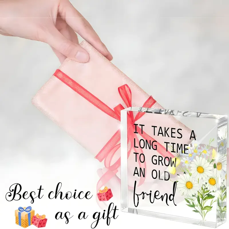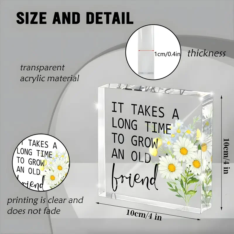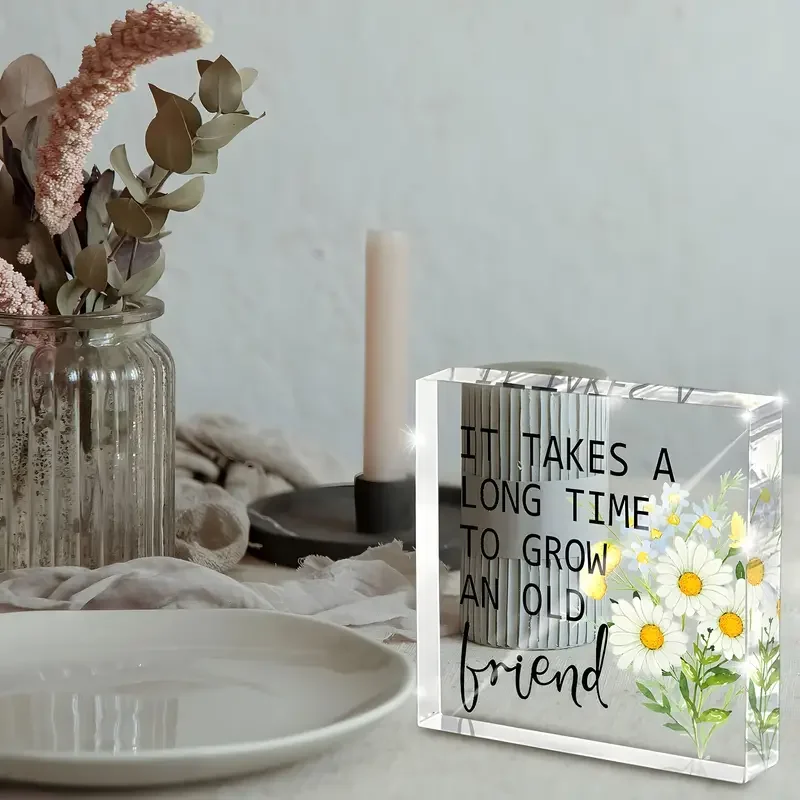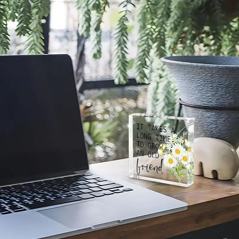 Imagine adding a touch of heartfelt inspiration to your workspace or shelf. This beautifully crafted acrylic desk decor features a clear, rectangular block that exudes modern elegance. Inside, floating colorful floral illustrations—white daisies with yellow centers, green leaves, and smaller yellow and blue flowers—create a lively and dimensional visual. The bold black text, stating “IT TAKES A LONG TIME TO GROW AN OLD FRIEND,” is partially in uppercase, with the word “friend” written in a charming cursive style, adding a personal touch. Its polished finish and sharp edges ensure a sleek look, making it an ideal friendship gift for women or men. This timeless piece combines aesthetic appeal with meaningful sentiment, perfect for inspiring daily positivity and cherished relationships.