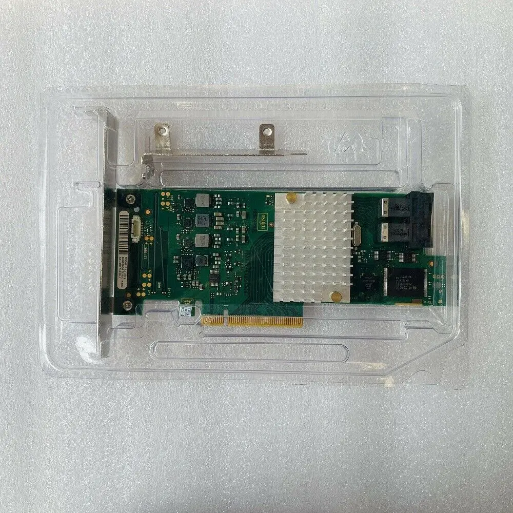 Enhance your server’s storage capabilities with this high-performance Fujitsu D3307-A12 RAID controller card, featuring the reliable LSI 9300-8I RAID controller with a 12GB memory capacity. Designed as an add-on PCI interface card, it supports multiple RAID configurations for flexible data management. The package includes an 8643-8482 SAS cable for seamless data connectivity, ensuring robust performance in data center or enterprise environments. The sleek green circuit board is complemented by a white heatsink, highlighted by a silver honeycomb-patterned mounting plate, with multiple black data ports and durable blue-black braided cables with right-angle connectors. This professional-grade expansion card combines technical precision with a modern, industrial aesthetic.