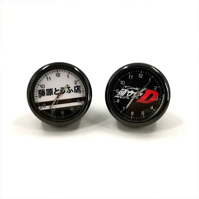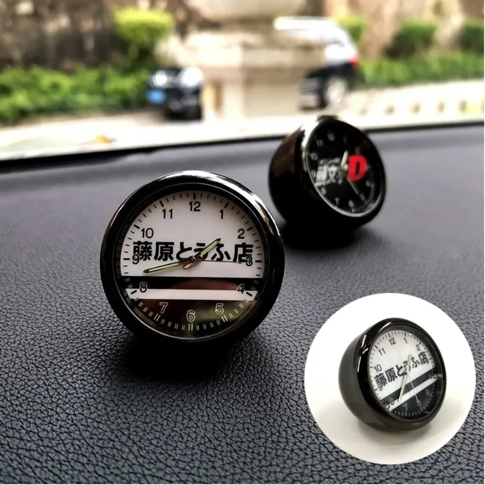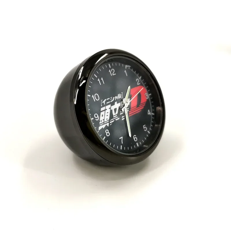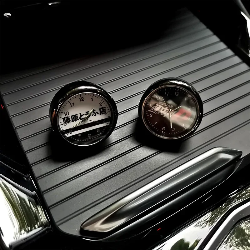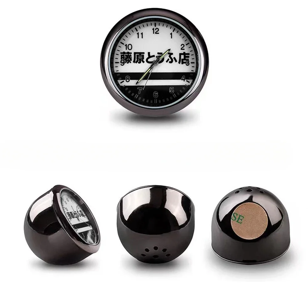 Enhance your vehicle’s interior with this sleek alloy car ornament clock, designed for the center console. Featuring a round, glossy black housing and a clear glass face, it displays bold Japanese characters overlaying a traditional dial with Arabic numerals from 1 to 12 and minute markers for easy readability. The slender Hands, in light contrasting color, add a subtle touch of elegance. This customizable clock offers multiple options, including humidity, temperature, time, and initial text such as “D” or “Tofu shop,” blending functional features with a minimalist, industrial aesthetic inspired by Japanese racing culture—perfect for adding a stylish, personalized touch to your car’s interior.