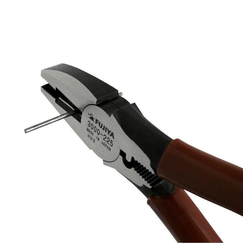 Experience the unmatched quality and functionality of this Fujiya 3000-225 lineman's plier, designed for professionals and DIY enthusiasts alike. With its high leverage power design, it offers effortless grip and strength, making tough tasks easier. The plier features a sleek, shiny chrome vanadium steel body with a precise cutting edge and a crimping section close to the fulcrum. Its bent handle improves leverage and comfort, while the textured, reddish-brown coated handles provide a secure grip. Suitable for electrical work, crimping connector terminals, or general DIY projects, this robust tool combines durability, efficiency, and practical style for heavy-duty use. Its Japanese origin ensures top-tier craftsmanship and performance.