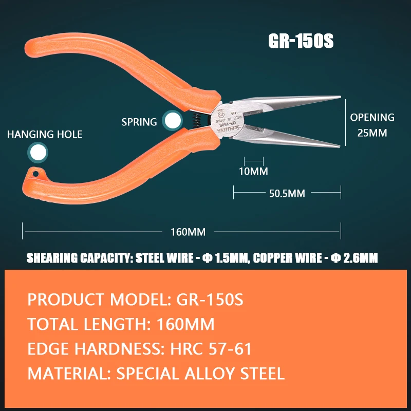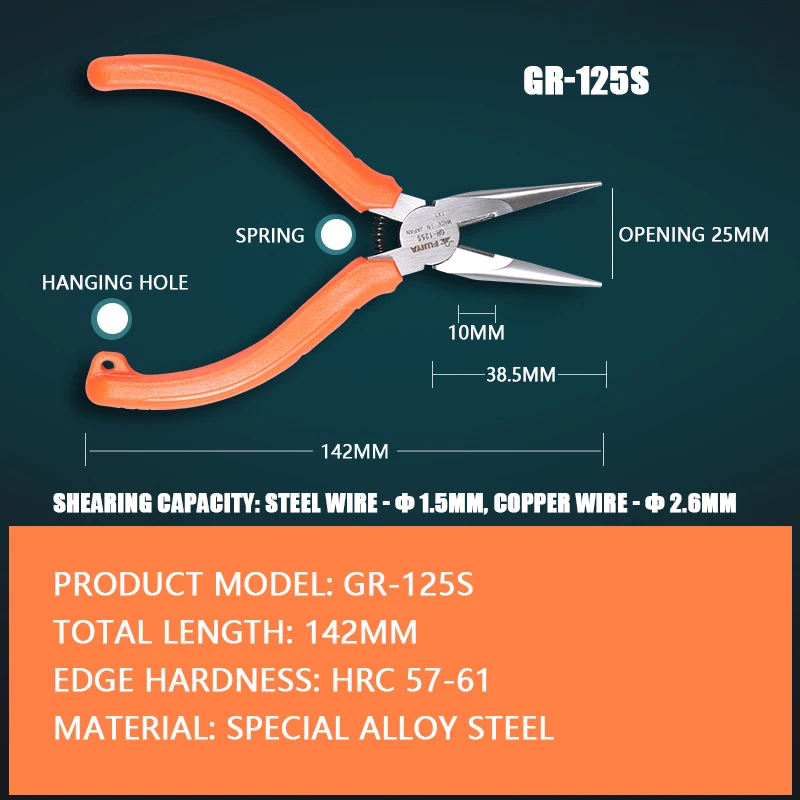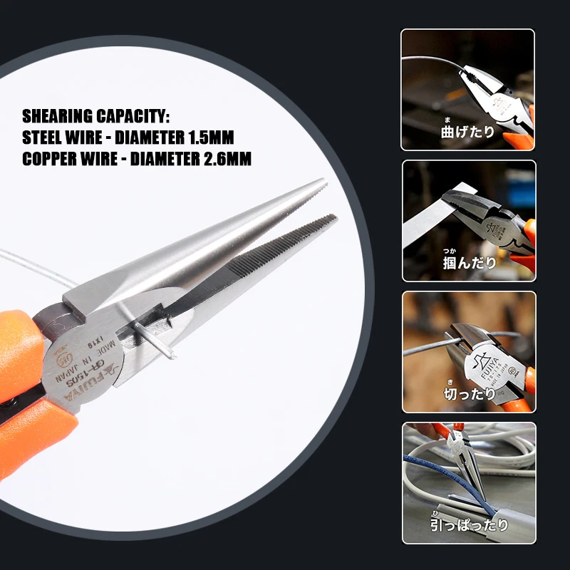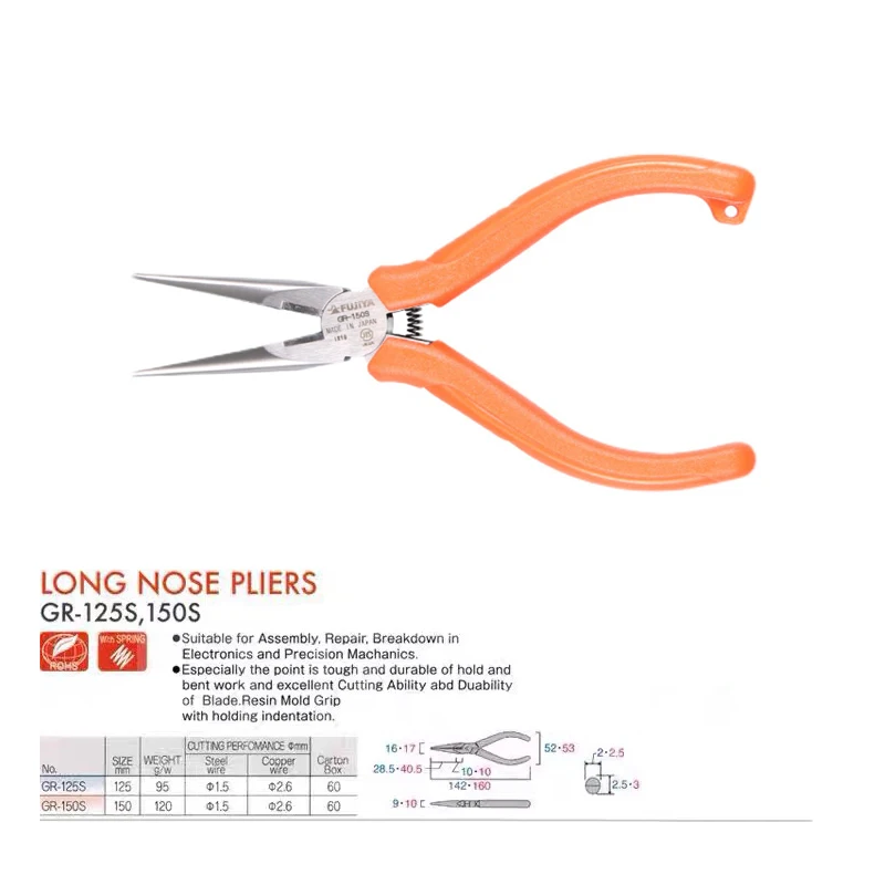 Keys features of the Fujiya GR-125S/GR-150S long nose pliers