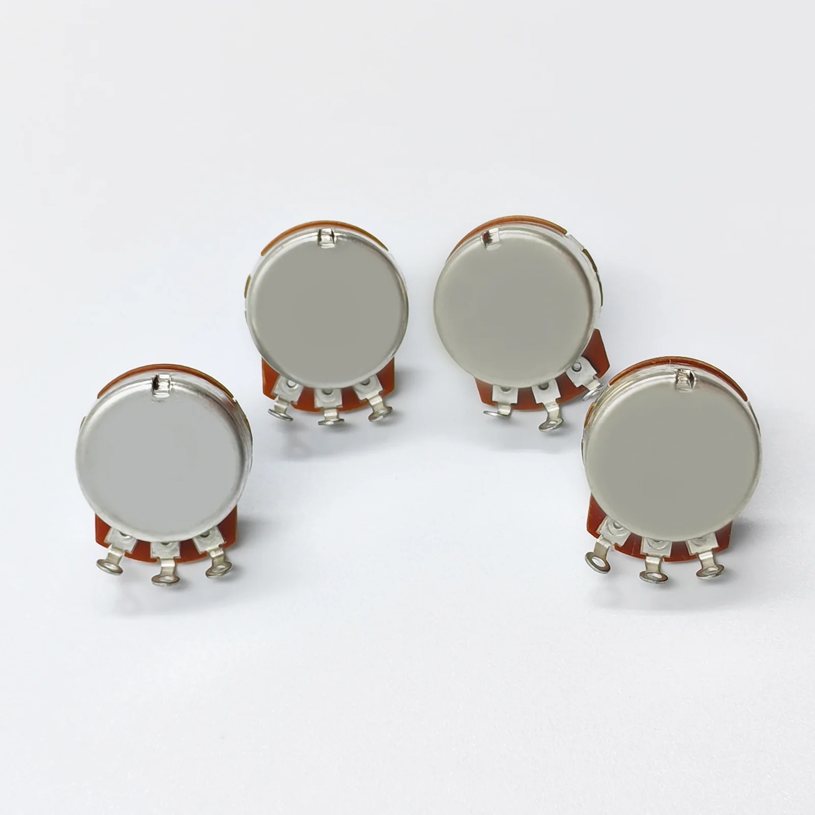 Experience the perfect upgrade with this set of four full-size electric guitar and bass potentiometers. Designed for both professional and personal use, these components feature a sleek metallic round base with a polished, reflective surface, measuring approximately 24mm in diameter. Rising from each base is a textured, 6mm diameter split shaft, about 18mm long, ensuring easy grip and precise adjustments. The durable threaded section, 8mm in diameter, allows secure mounting. With resistance options of 250KΩ or 500KΩ and a tolerance of ±20%, these potentiometers offer versatile control over your sound. Ideal for tone or volume, they integrate seamlessly into most guitar control plates and pickguards, combining functionality with a refined, industrial aesthetic that complements any instrument.