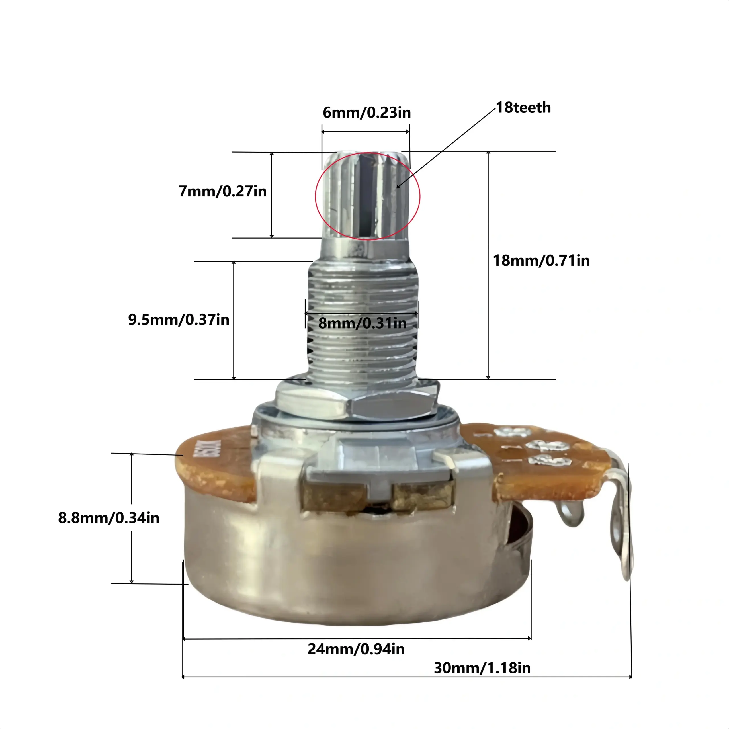 - Each potentiometer features a 6mm split shaft with coarse knurling, an 18mm length, and a threaded section of 8mm diameter, compatible with most control knobs for quick installation.