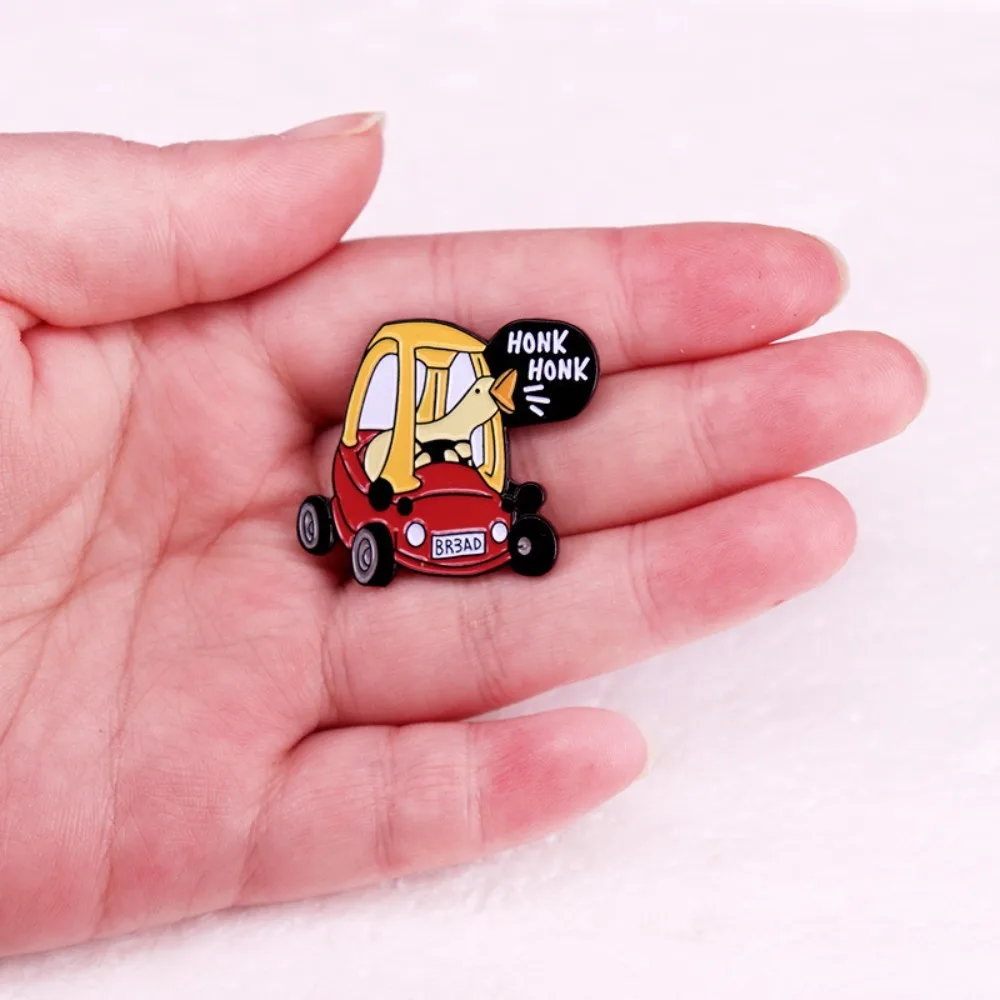 This whimsical brooch features a cartoon goose joyfully driving a vibrant red car with yellow accents. The goose, with a light yellow body and an orange beak, boasts a playful expression while facing the viewer, complemented by a humorous “Honk Honk” speech bubble. Its round black wheels and detailed license plate reading “BR3AD” add charm to the design. Made from durable alloy metal with a vivid enamel finish, this trendy and funny accessory is perfect for jackets, backpacks, hats, and DIY clothing. The brooch’s size may vary slightly by 1-3mm due to measurement differences.