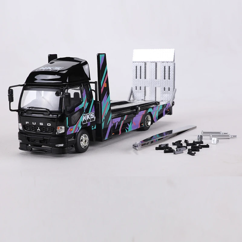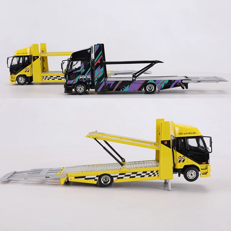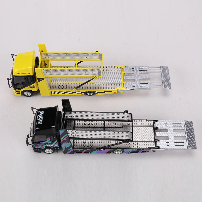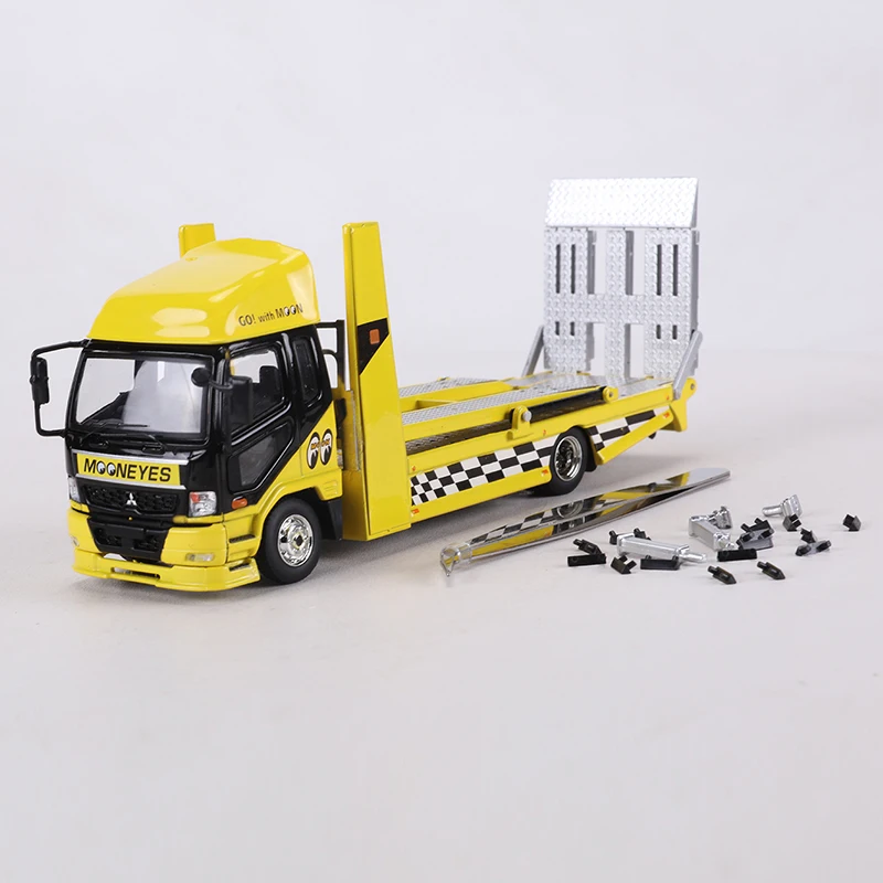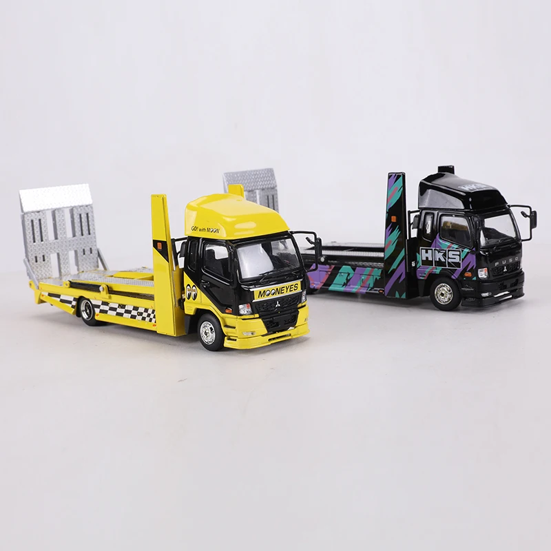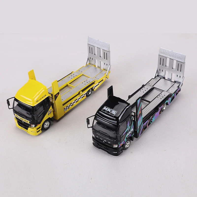 Immerse yourself in the detailed realism of this 1:64 scale diecast Fuso Fighter 2017 double-deck tow truck model, crafted from high-quality metal with alloy body construction. Featuring vibrant yellow with black accents and a sleek, modern design, this model showcases a prominent black grille, curved windshields, and intricately detailed wheels with silver hubcaps. The flatbed extends with textured silver barriers and lattice details, capturing an authentic industrial look. Perfect for collectors aged 14 and above, this non-electrical, precision-crafted model combines striking aesthetics with precise proportions, making it an ideal addition to any collection that appreciates high-quality, detailed diecast trucks.
