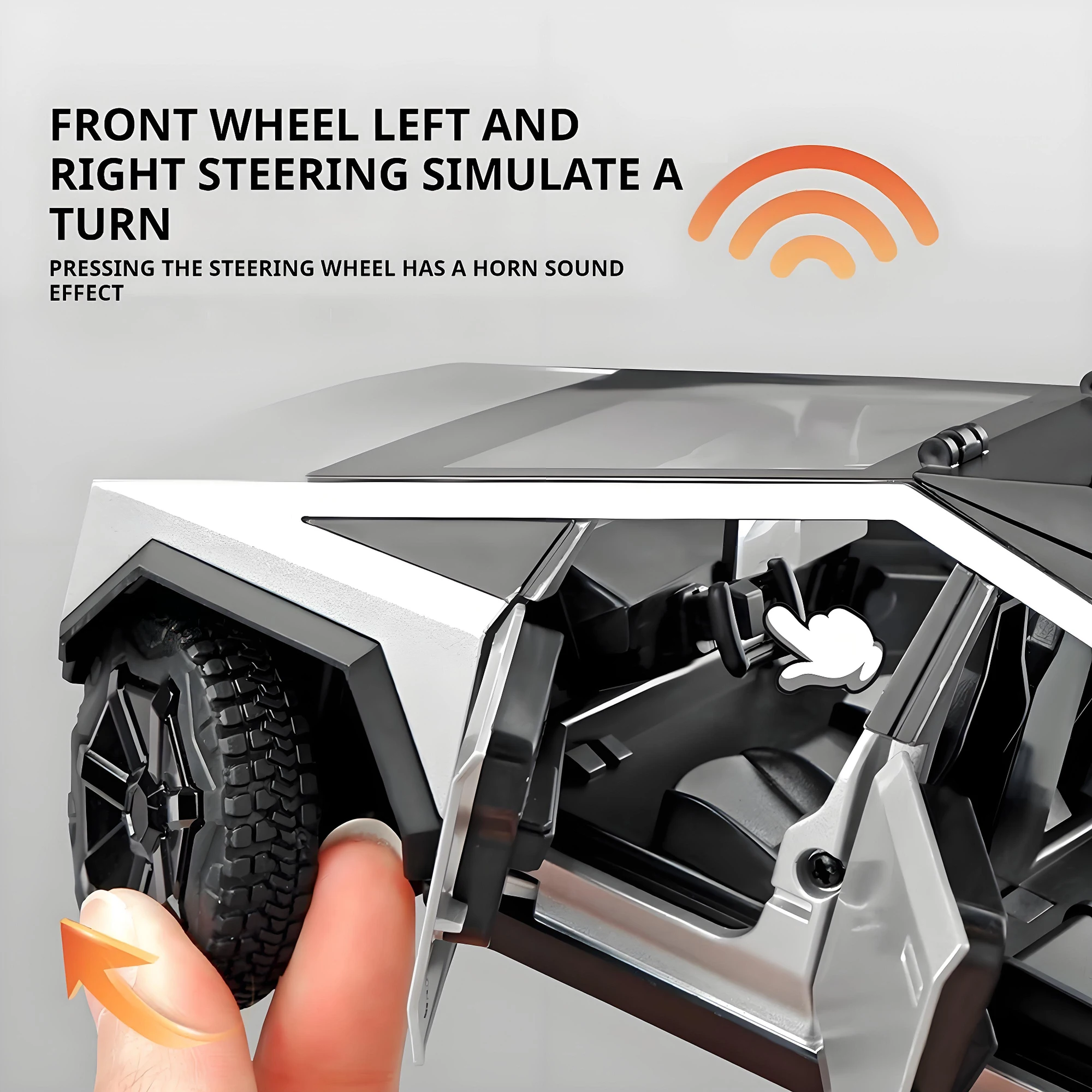 This stunning 1/24 scale metal die-cast pickup truck model features a bold and futuristic design with sharp geometric shapes. The primary metallic silver finish is beautifully accented with rugged black elements, enhancing its robust aesthetic. With sound and light effects, this interactive model not only captivates the eye but also provides playability with its innovative shock-absorbing capabilities. Equipped with opening doors and a hatch compartment, you'll enjoy exploring the detailed craftsmanship. Choose between boxed gray, boxed green, and boxed silver to suit your style and unleash your creativity with this exceptional model that promises endless fun.