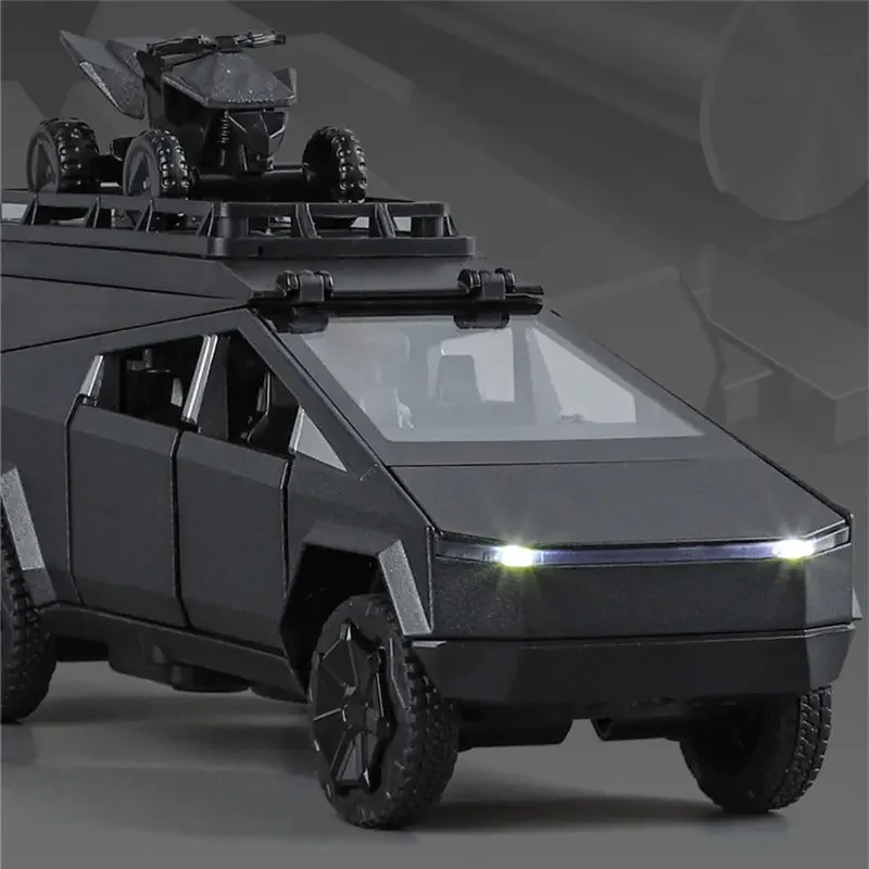 Experience owning a stunning piece of modern automotive design with this highly detailed 1/32 scale model from XHD. Crafted from durable alloy and lightweight plastic, it combines realism and portability effortlessly. The model’s sleek, angular aesthetics feature polygonal panels and sharp geometric lines, highlighted by a polished metallic silver finish that accentuates its contemporary style. Large, rugged tires with deep treads and thick black rims complement its high-tech look while ensuring a durable appearance. The deep black windows create a striking contrast, emphasizing its futuristic elegance. Integrated solar panels mounted atop the vehicle enhance its eco-friendly appeal. Interactive light and sound functions powered by batteries deliver an engaging display experience, making it a perfect addition for enthusiasts and collectors alike.