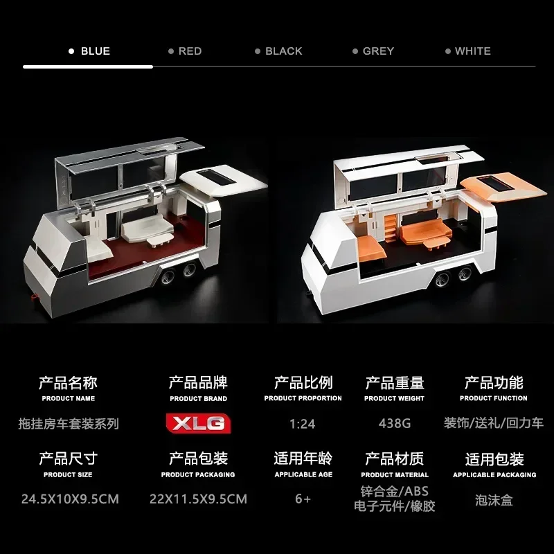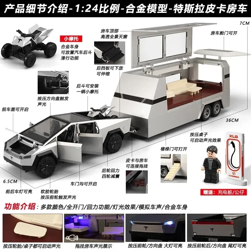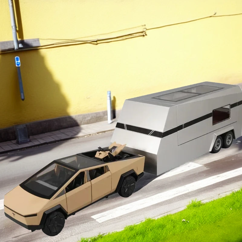 Experience the thrill of owning this stunning 1:24 scale diecast model featuring a sleek, futuristic vehicle and matching camper trailer. Crafted with meticulous attention to detail, the vehicle boasts a modern, angular design in a smooth metallic silver finish, complemented by sharp edges and flat surfaces that evoke a high-tech, minimalist aesthetic. The camper trailer echoes this futuristic vibe with a silver exterior and a versatile pop-up roof, offering extended play possibilities. The set includes miniature accessories like a charging station, adding realism and interactivity. Open the doors and windows to reveal a detailed interior with a tasteful two-tone color scheme. This vibrant combination of aesthetics and functionality makes it a perfect collectible or gift for imaginative outdoor adventures.