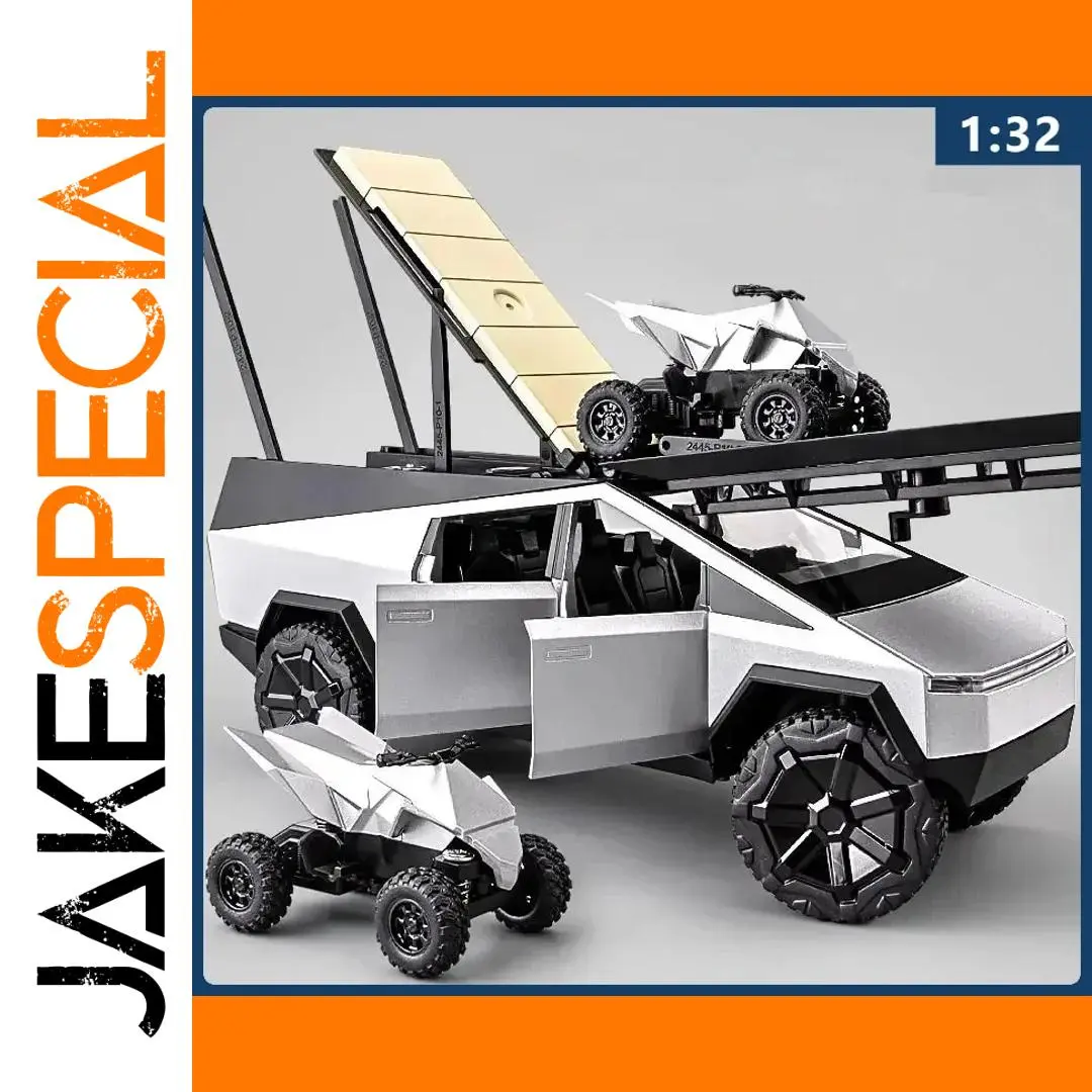 Experience the thrill of owning this highly detailed 1:32 scale diecast model of a modern electric pickup truck. Crafted with precision, it features a sleek, angular design with a geometric aesthetic reminiscent of futuristic vehicles. The body exudes a metallic silver finish with a matte or semi-gloss surface, highlighting its sophisticated and contemporary look. Large, rugged off-road tires with prominent rims give it an adventurous appeal, perfect for display or inspiring your imagination. The model showcases authentic detail from the sharp edges to the flat surfaces, emphasizing its minimalist and aerodynamic style. Whether positioned on a shelf or used for imaginative scenes, this vehicle embodies innovation, durability, and a passion for exploration.