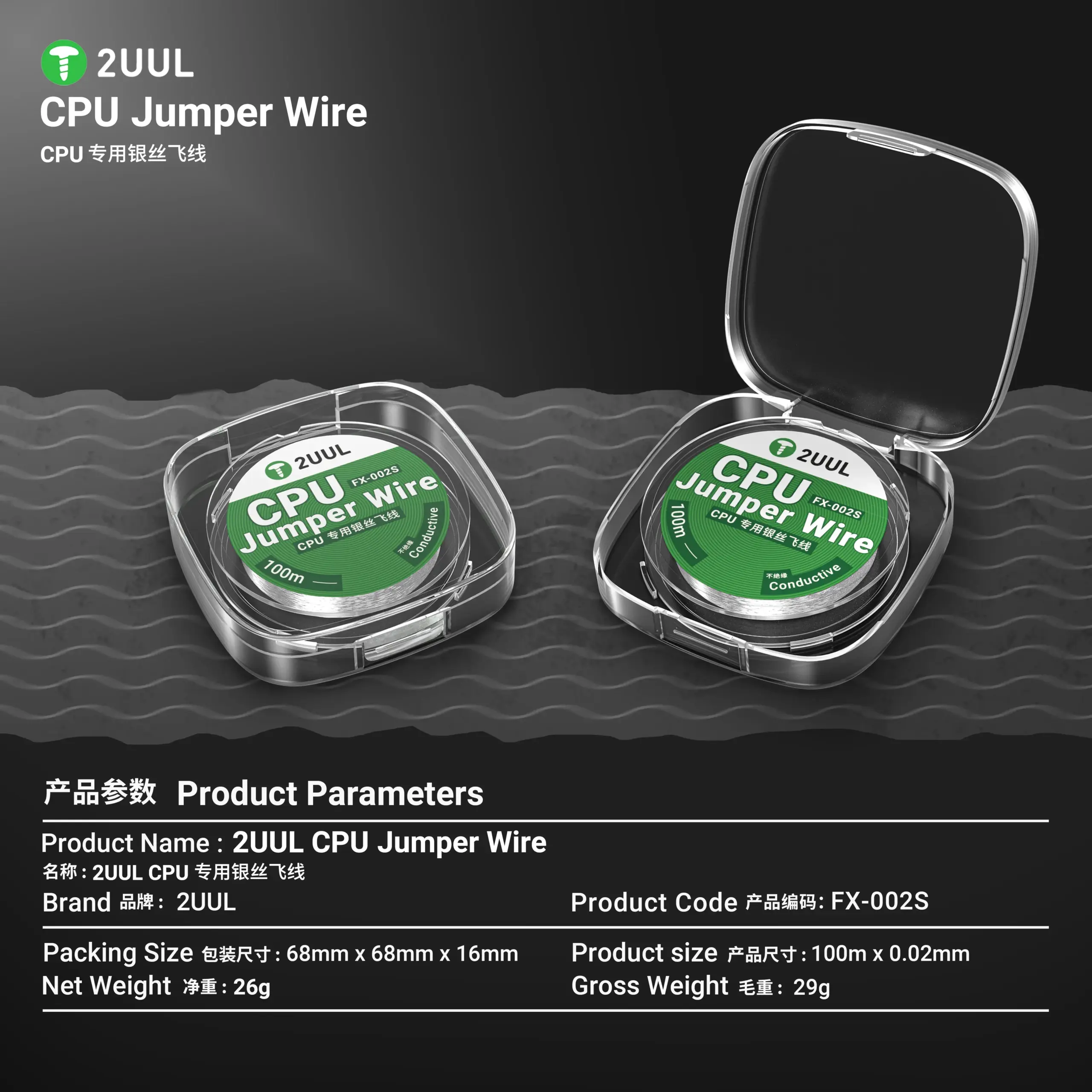 - Specifications include 100 meters length, 0.02mm wire diameter, high conductivity silver material, with compatibility for CPU pad repair, PCB jumper connections, and BGA rework.