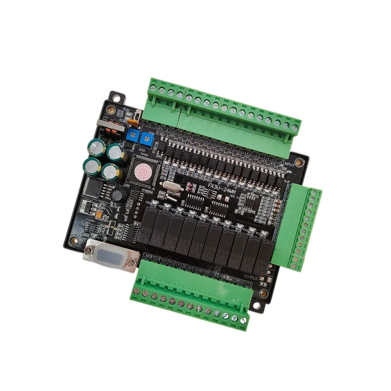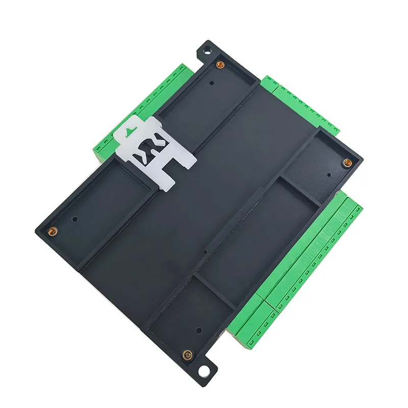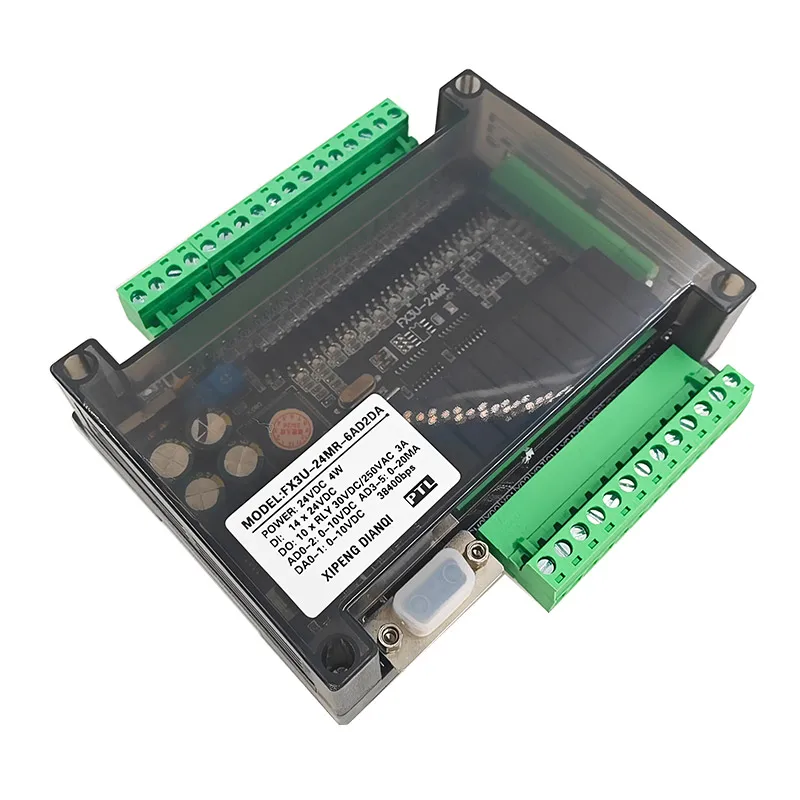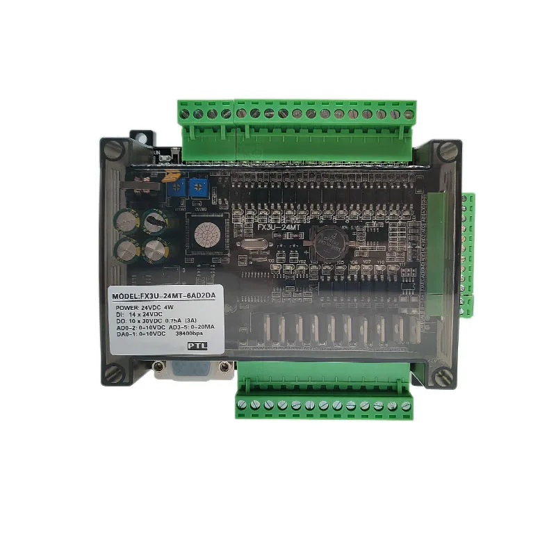 Experience the practical robustness of this FX3U PLC with a sleek transparent plastic housing that reveals intricate internal circuitry, emphasizing durability and modern industrial aesthetics. Designed for easy installation and maintenance, this device features a compact footprint similar to a paperback book, making it perfect for tight spaces in factories and control panels. The internal black circuit board dotted with colorful components creates a highly technical visual, while bright green terminal blocks provide clear, accessible wiring points. Whether used in automation or machine control, this PLC embodies efficiency and reliability, with an emphasis on visual monitoring of the internal components, making diagnostics straightforward. Its sturdy design is built for intense industrial environments, ensuring your processes run smoothly and securely.