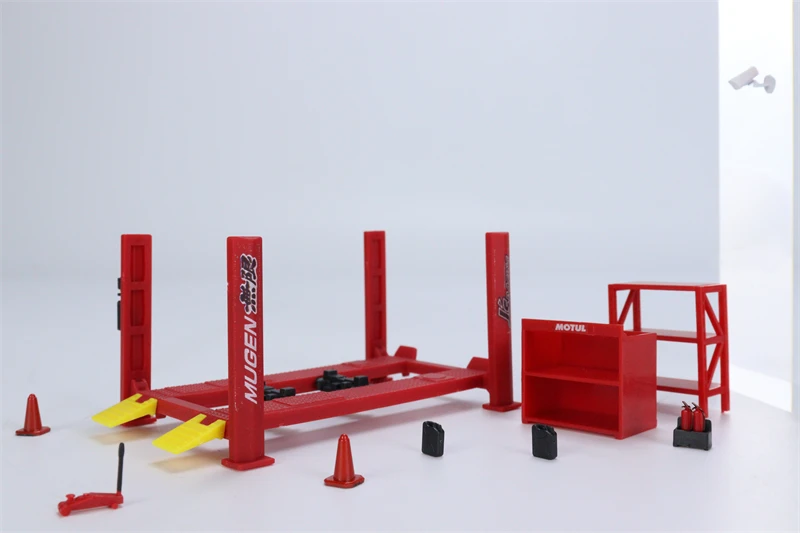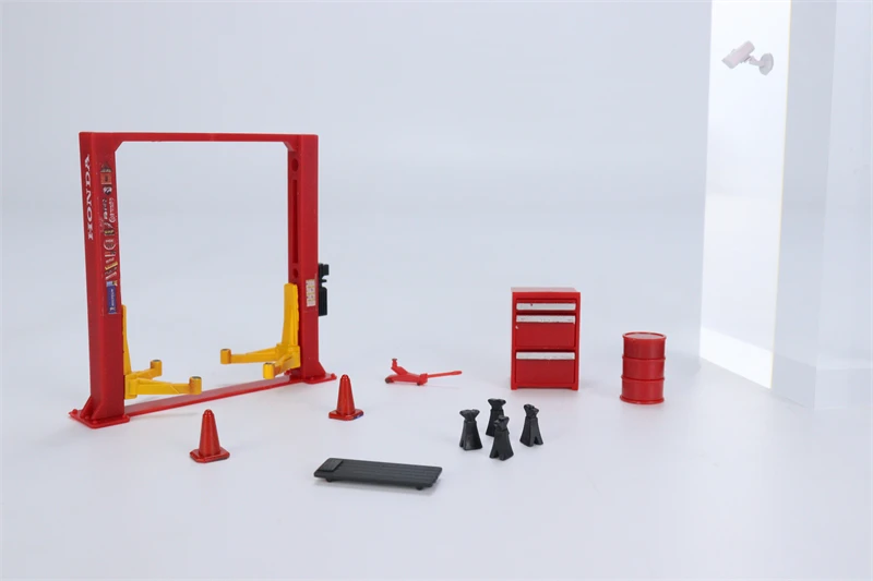 Bring your collection to life with this detailed 1:64 scale diecast metal scene featuring a maintenance workshop for toy vehicles. Crafted from alloy, it showcases vibrant color options including black (710012B, 710012A, 710011A, 710011B) and red hues, with contrasting accents of yellow and orange. The set includes adjustable workbenches, display shelves, racks, cones, and miniature tools, all designed with intricate craftsmanship for an authentic industrial look. Non-electric and suitable for ages 14+, this miniature scene offers a realistic and playful environment, perfect for collectors and enthusiasts to create dynamic display setups and enhance any model vehicle collection.