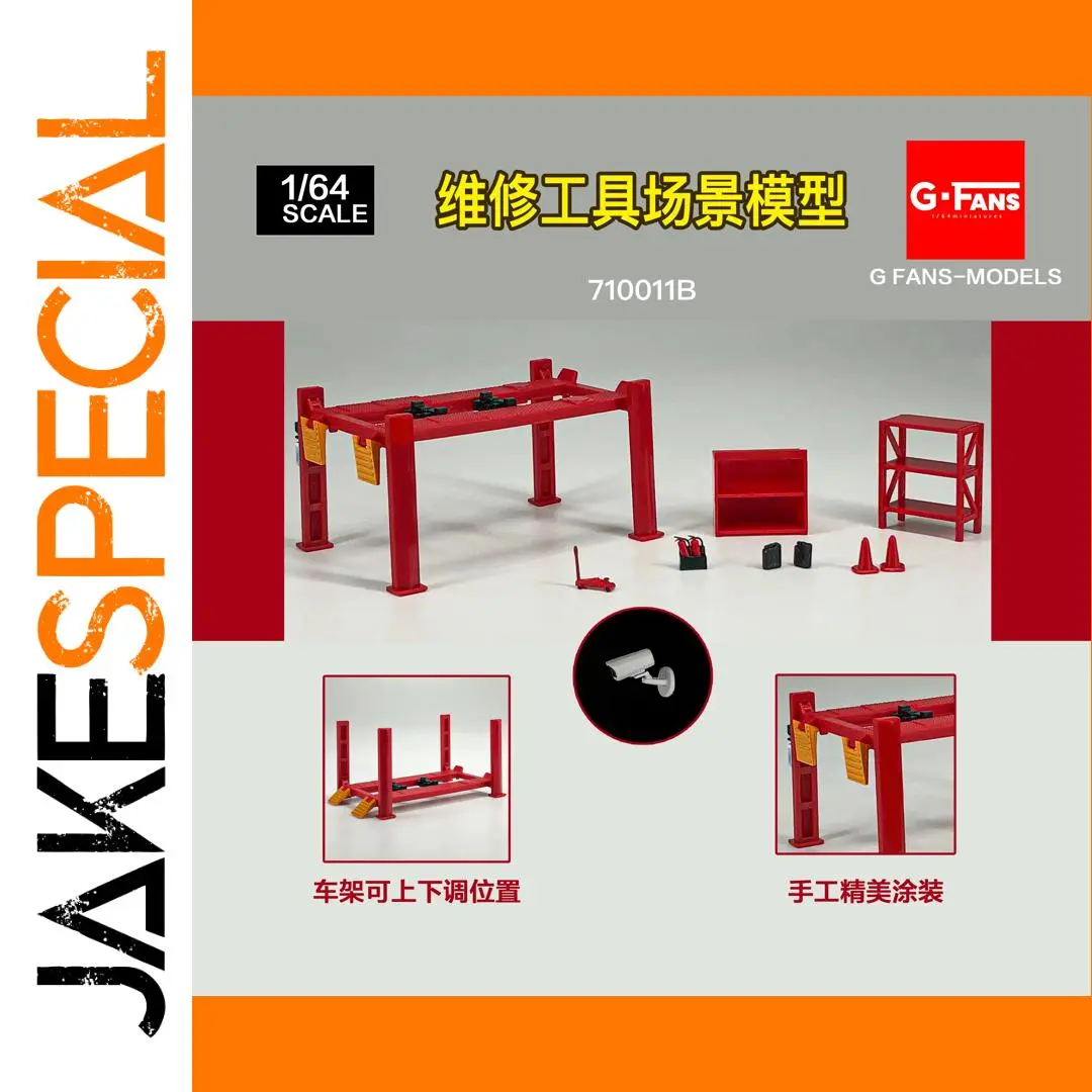 This stunning GFans 1/64 scale workshop model captures the intricate details of a mechanic's workspace. Featuring a vibrant red workbench with adjustable heights, tools, and an array of smaller items like toolboxes and traffic cones, this model is perfect for collectors. The carefully crafted storage shelf adds to the realism, while the included surveillance camera signifies security in the setting. This piece is not just a model; it serves as an engaging and visually appealing decoration, making it an ideal addition to any miniature display or diorama, letting you immerse in the world of automotive repair and creativity.