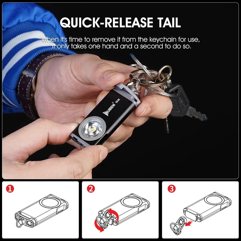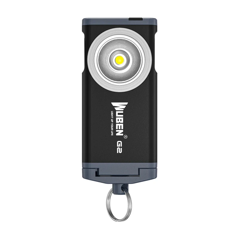 The G2 Mini EDC Keychain Light is a compact, waterproof pocket flashlight delivering up to 500 lumens with five adjustable modes: Turbo, High, Med, Low, and Moon. Crafted from durable 6061 aviation aluminum alloy, it features P9 LED beads, a beam distance of less than 50 meters, and a 175° wide-angle floodlight. Its sleek black design includes side groove clips for easy attachment and a magnetic tail for hands-free use on metal surfaces. Rechargeable via Type-C in approximately 1.5 hours, this lightweight, rugged flashlight is ideal for outdoor activities like camping, hiking, and riding, combining practicality with modern style.
