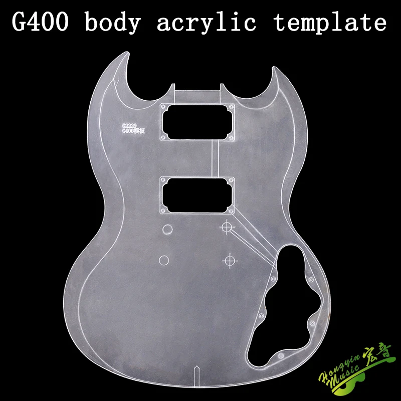 Imagine perfecting your guitar craft with ease, thanks to this transparent acrylic G400 style guitar body template. Crafted from durable 4mm thick acrylic, this template offers a clear view of your project, ensuring precise shaping and placement. Its sleek, modern design features a bold double-cutaway shape with sharp, pointed horns, embodying a contemporary aesthetic. The smooth edges and engraved markings provide accurate guidance for component placement, while the evenly spaced mounting holes streamline assembly. Ideal for luthiers and guitar repair specialists, this template helps you achieve professional results effortlessly. Use it to trace, align, or modify your guitar body with confidence, enhancing your craftsmanship and workflow for personalized, high-quality guitar builds.